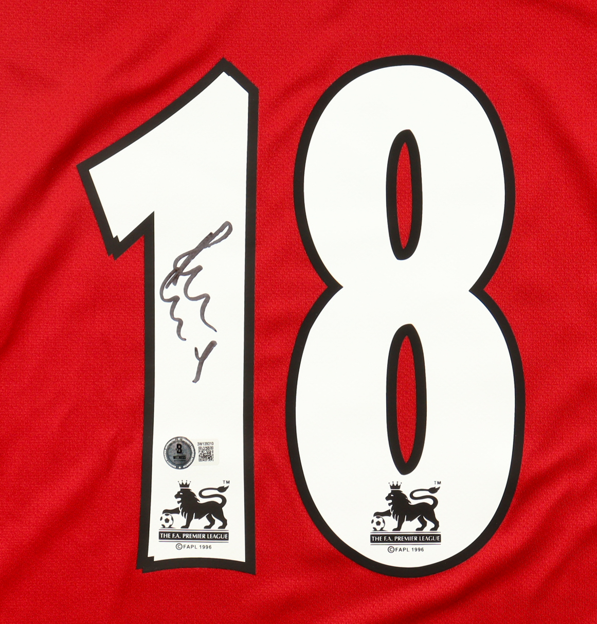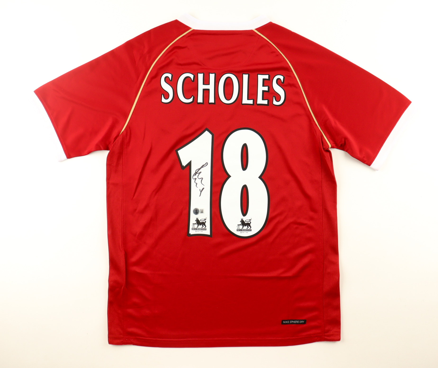 Nike jersey with everything pressed on, size M. Hand-signed by Paul Scholes.