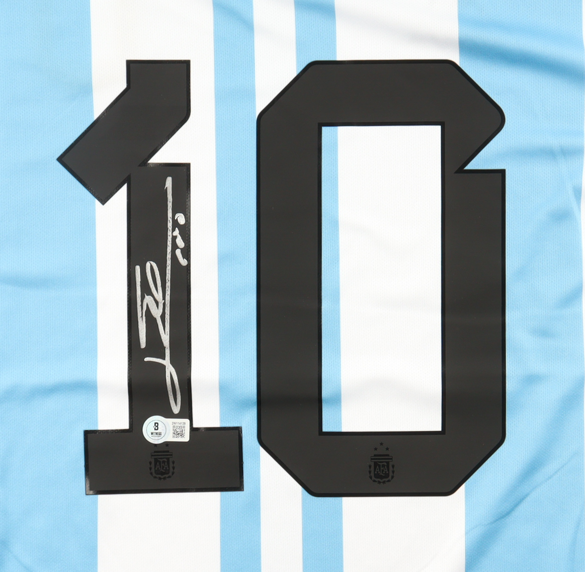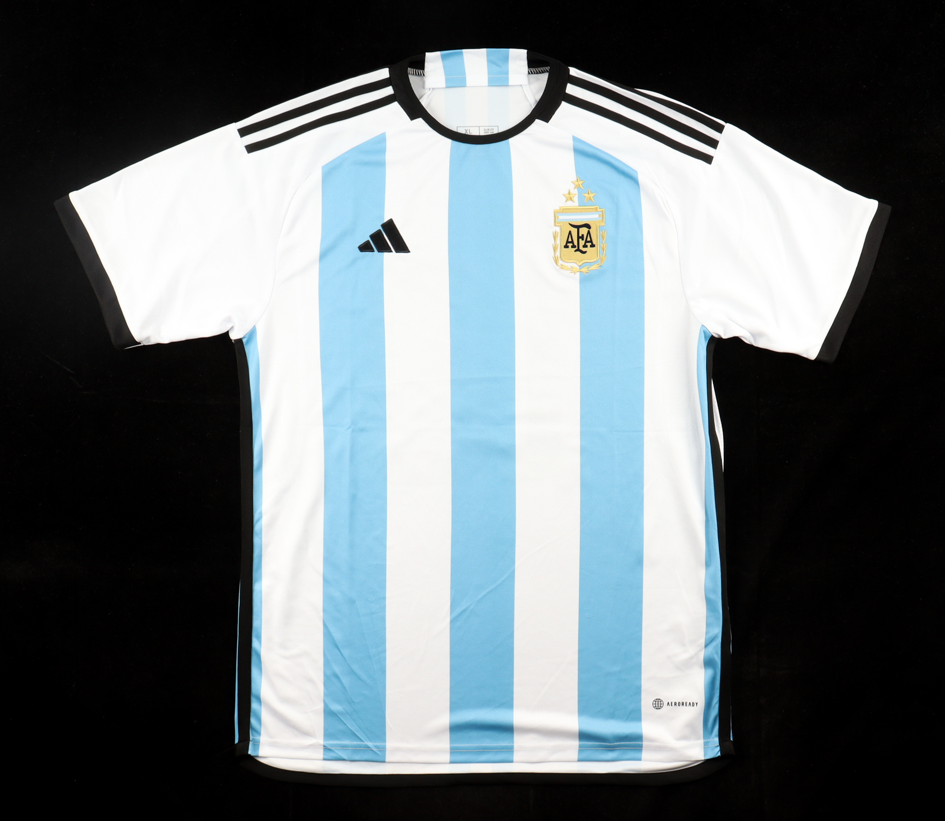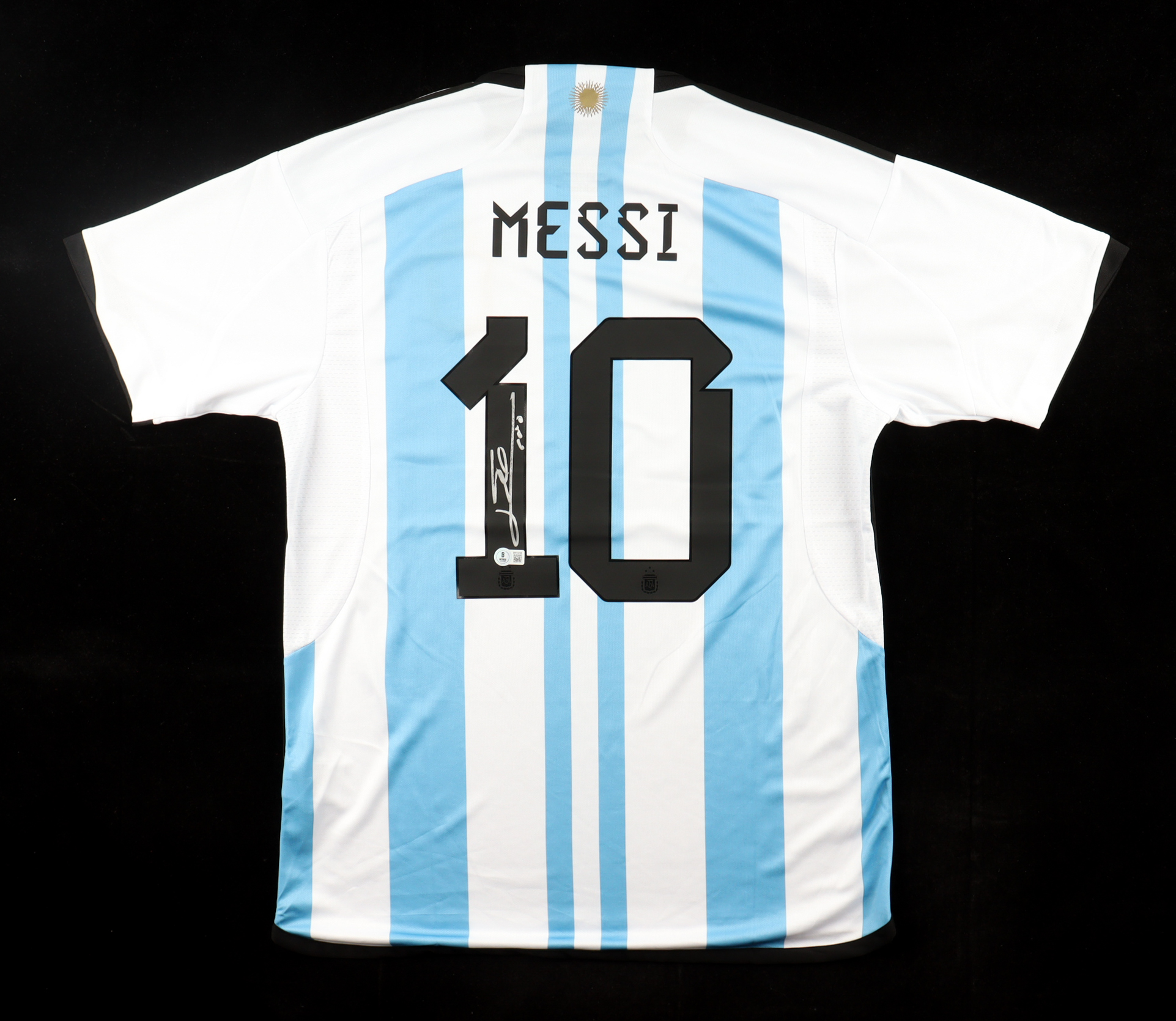 Adidas jersey with everything printed on, size XL. Hand-signed and inscribed by Lionel Messi (Team Argentina).