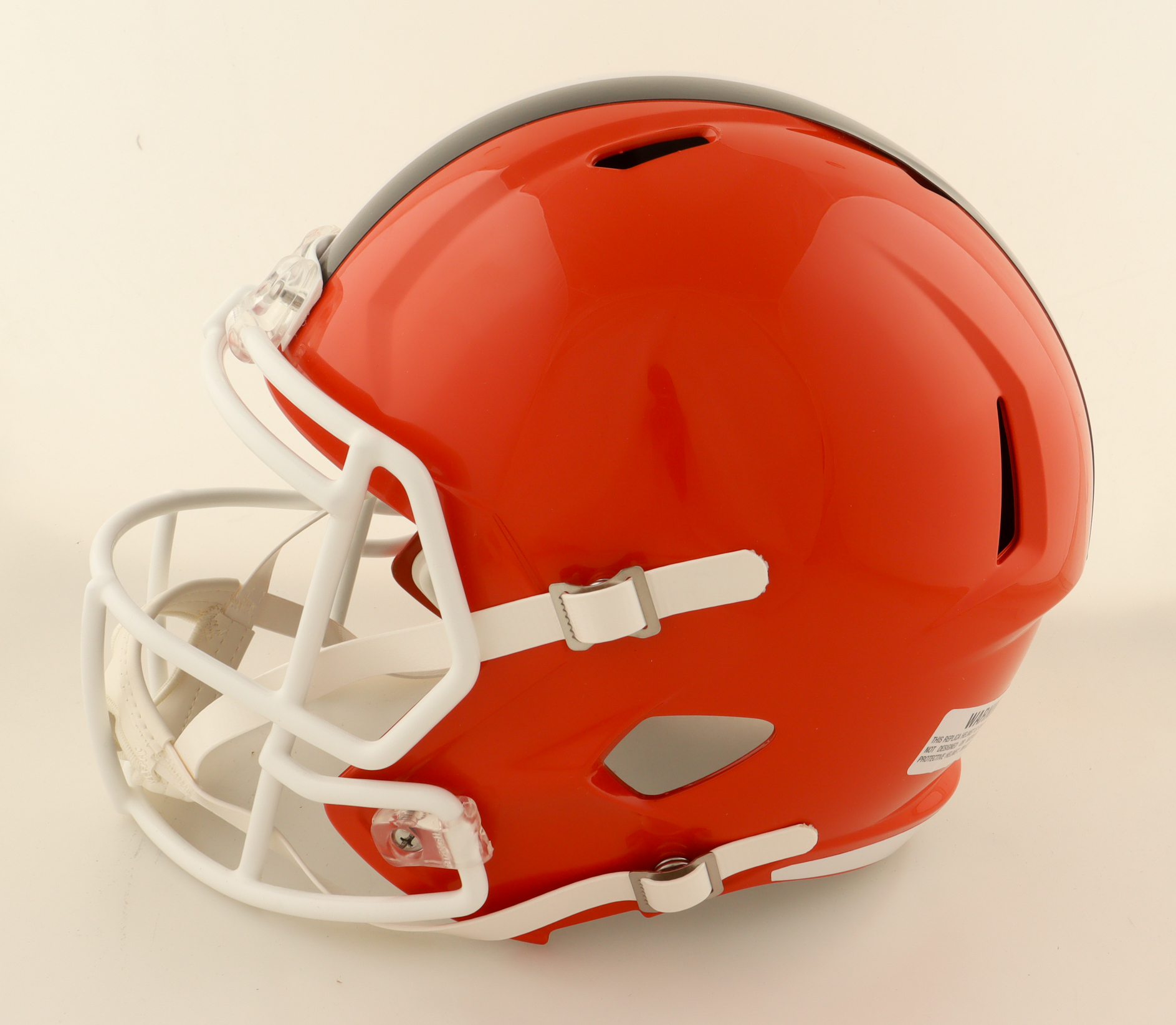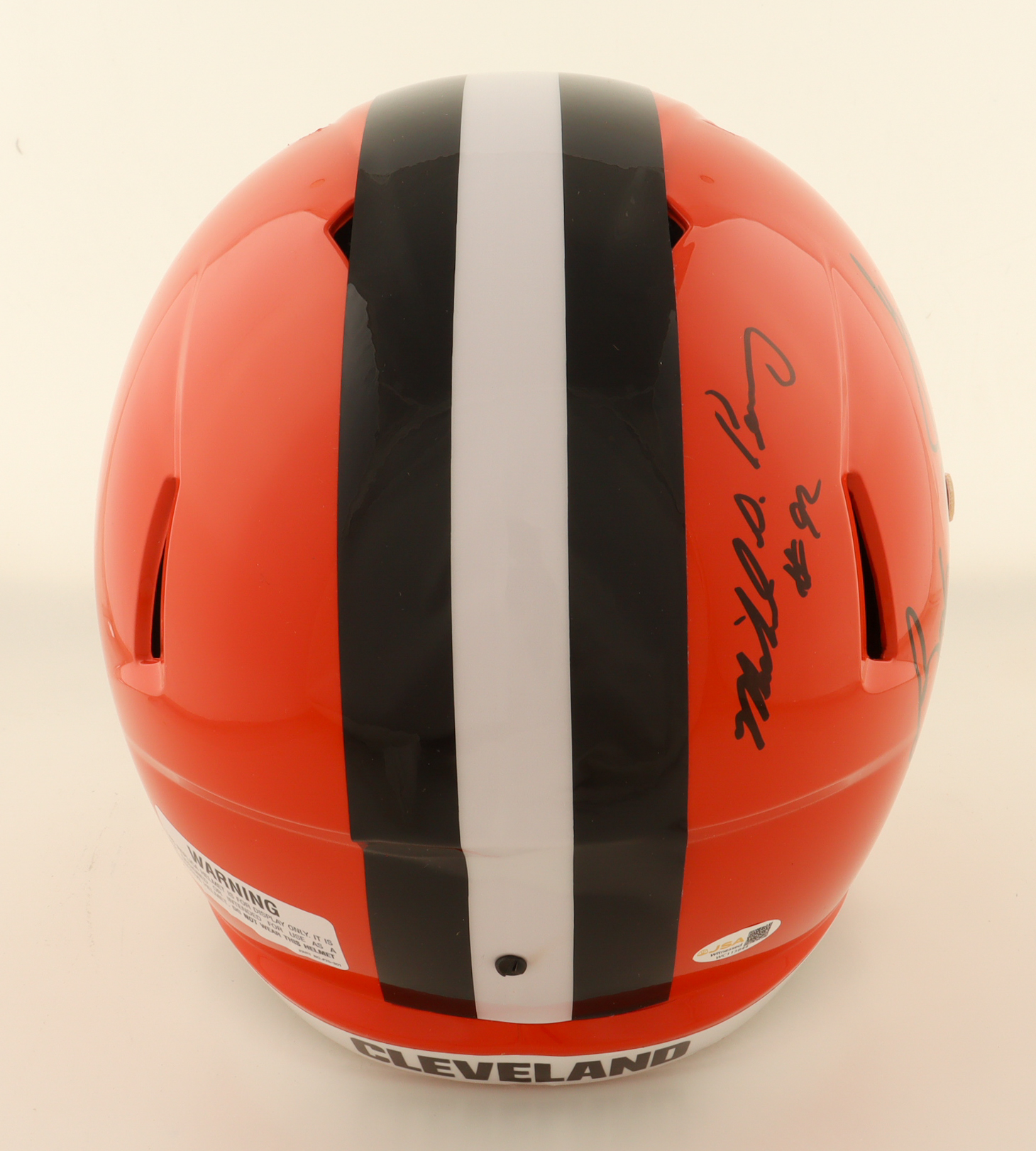 Riddell Cleveland Browns Full-Size Speed Replica Helmet. Hand-signed by Bob Golic, Greg Pruitt and Michael Dean Perry.