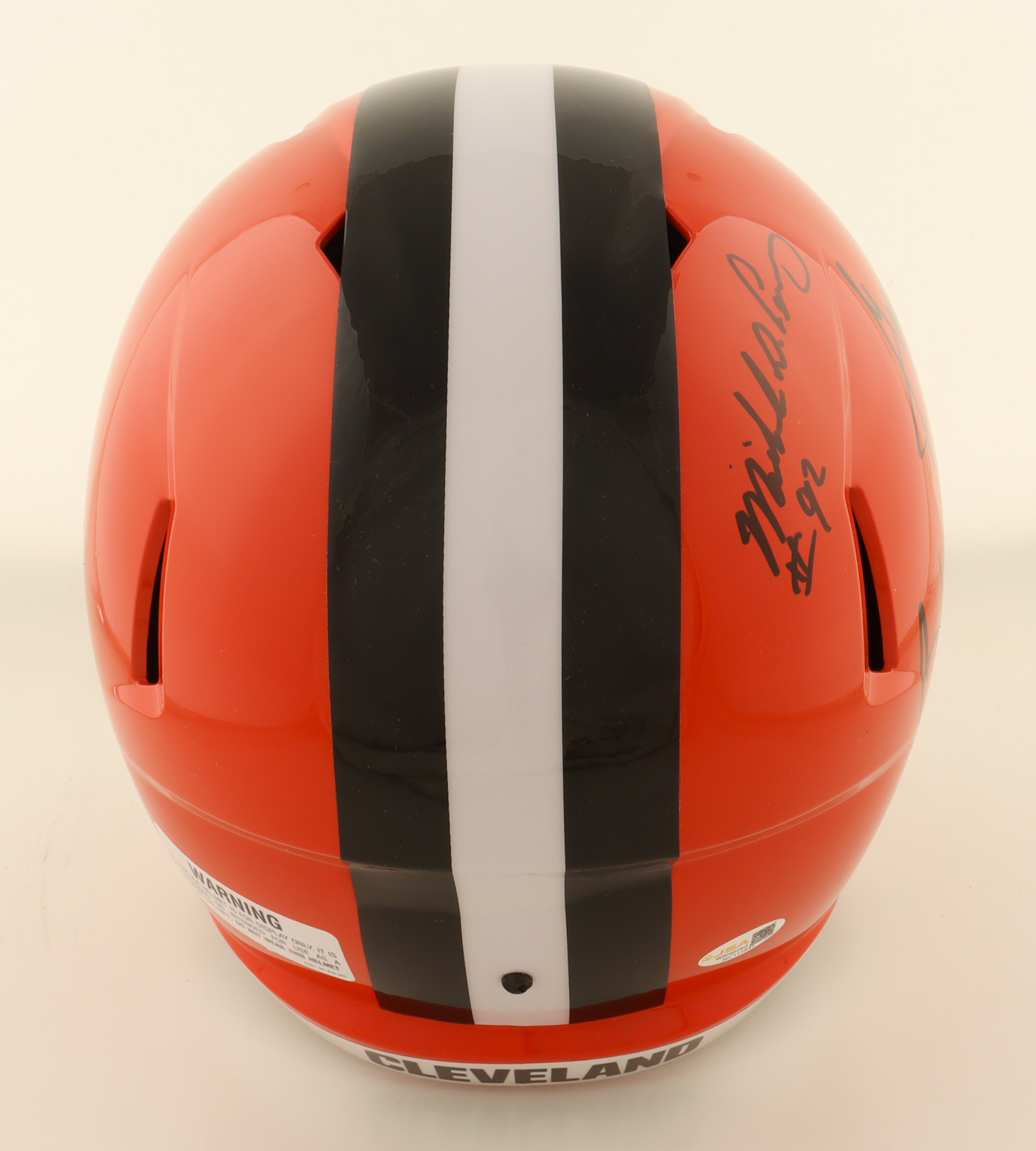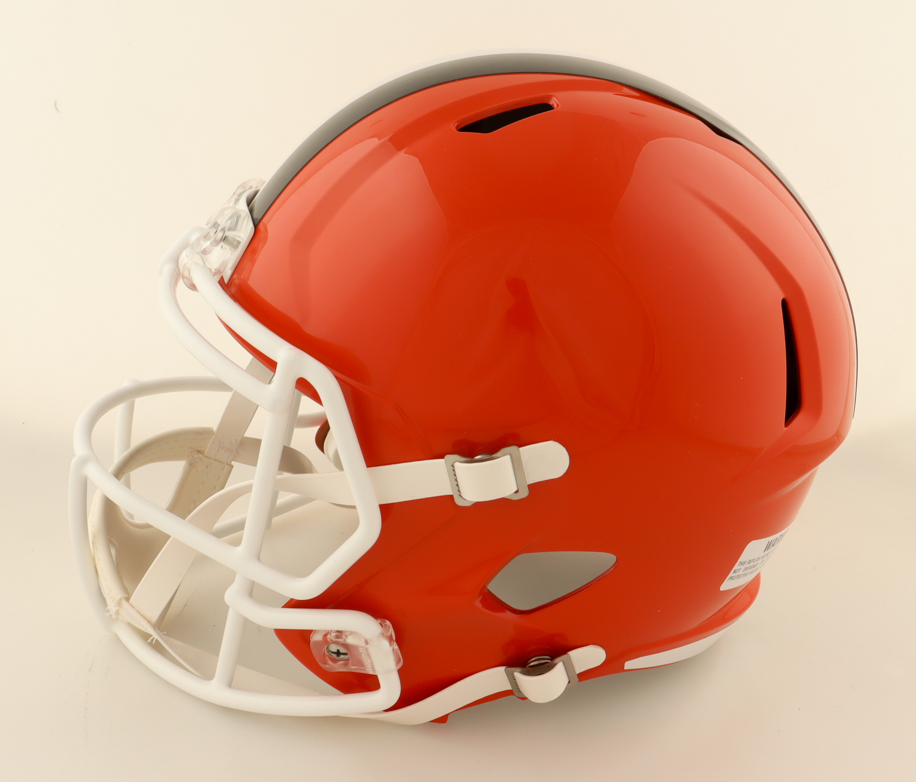 Riddell Cleveland Browns Full-Size Speed Replica Helmet. Hand-signed by Bob Golic, Greg Pruitt and Michael Dean Perry.