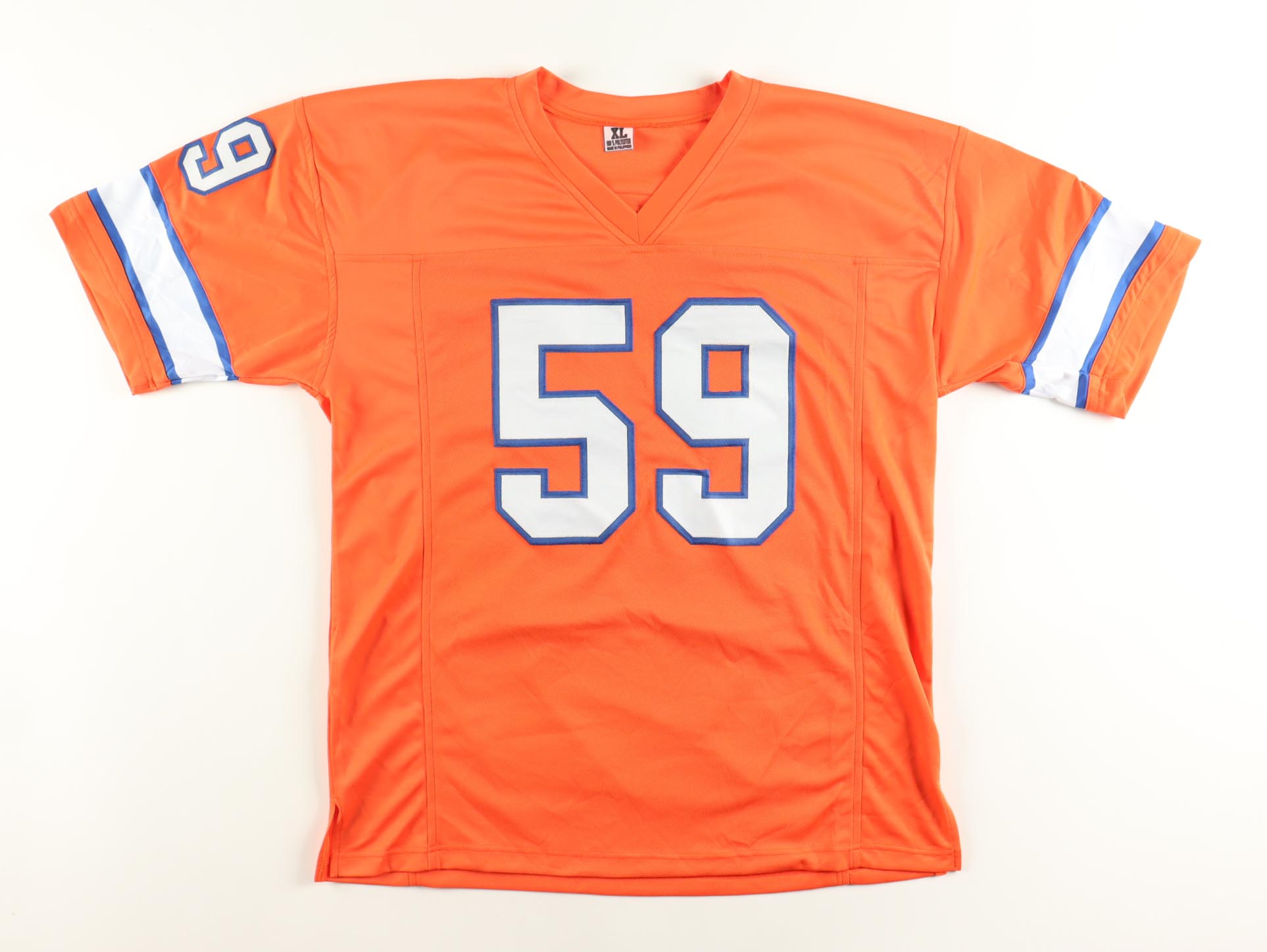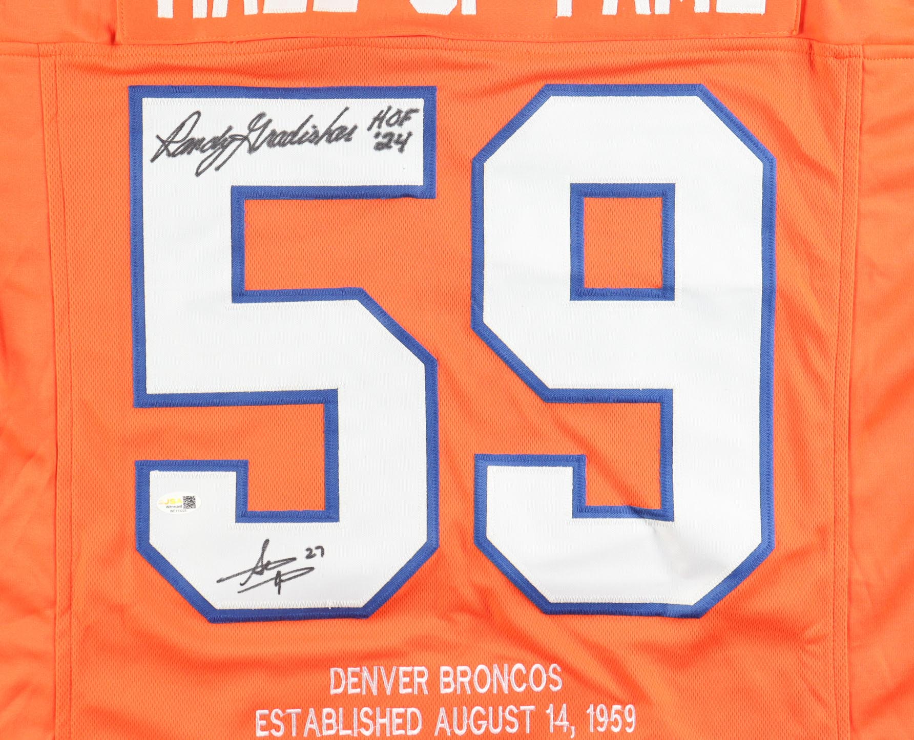 Custom jersey. Everything is sewn on, size XL. Hand-signed and inscribed by Randy Gradishar & Steve Atwater. (HOF). The Broncos career highlights have been custom stitched onto the back of the jersey below the reverse numbers. Please note, the signature and inscription have bled.