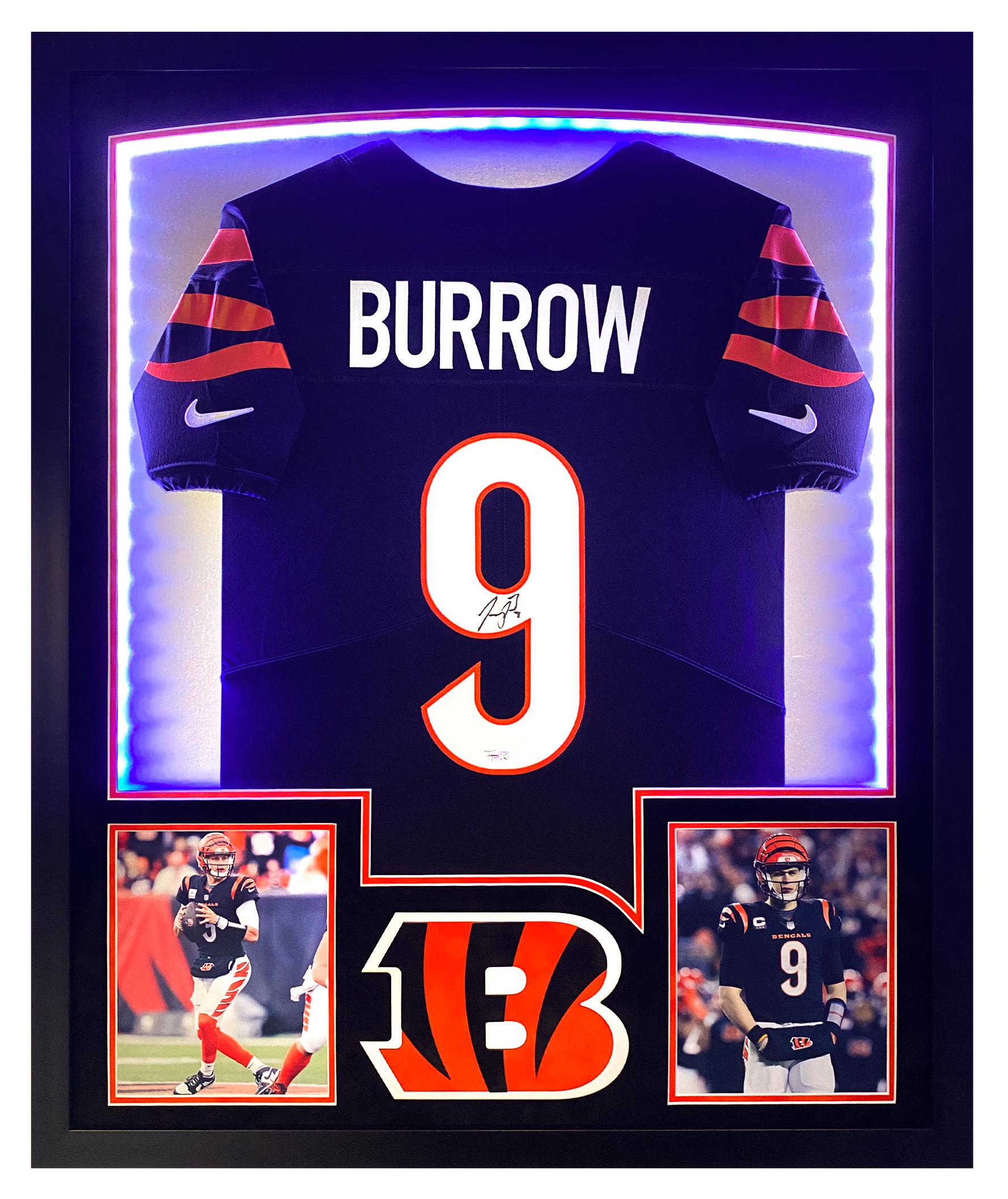 Custom frame measures approximately 32” x 40” in size. Featuring a Nike Elite jersey that has been hand-signed by Joe Burrow (Cincinnati Bengals). LED Lights have been added to this frame to give it a one of a kind look. With the USB Powered Lights, simply turn it on when you want to light it up and show it off.