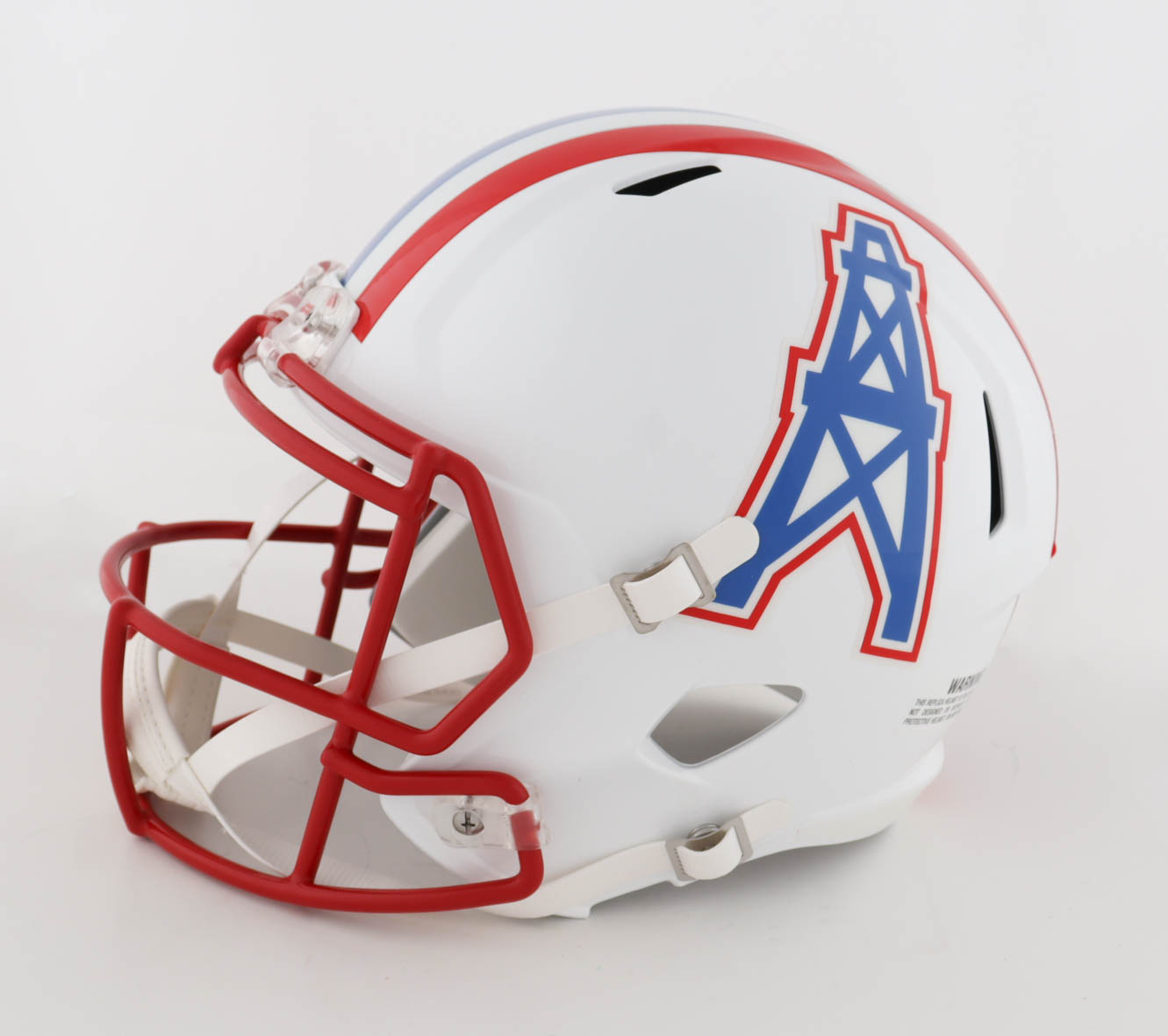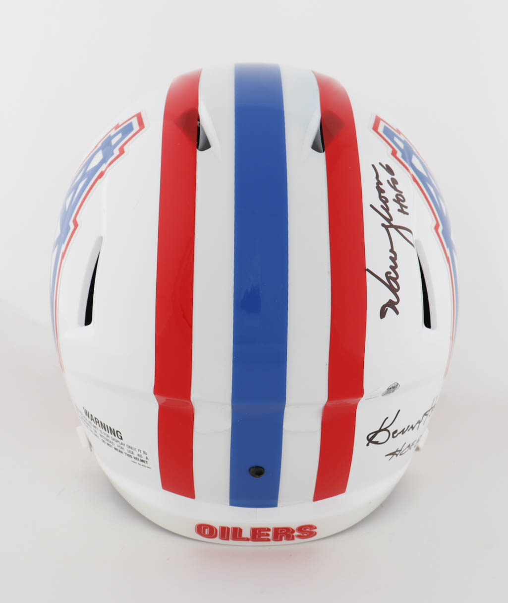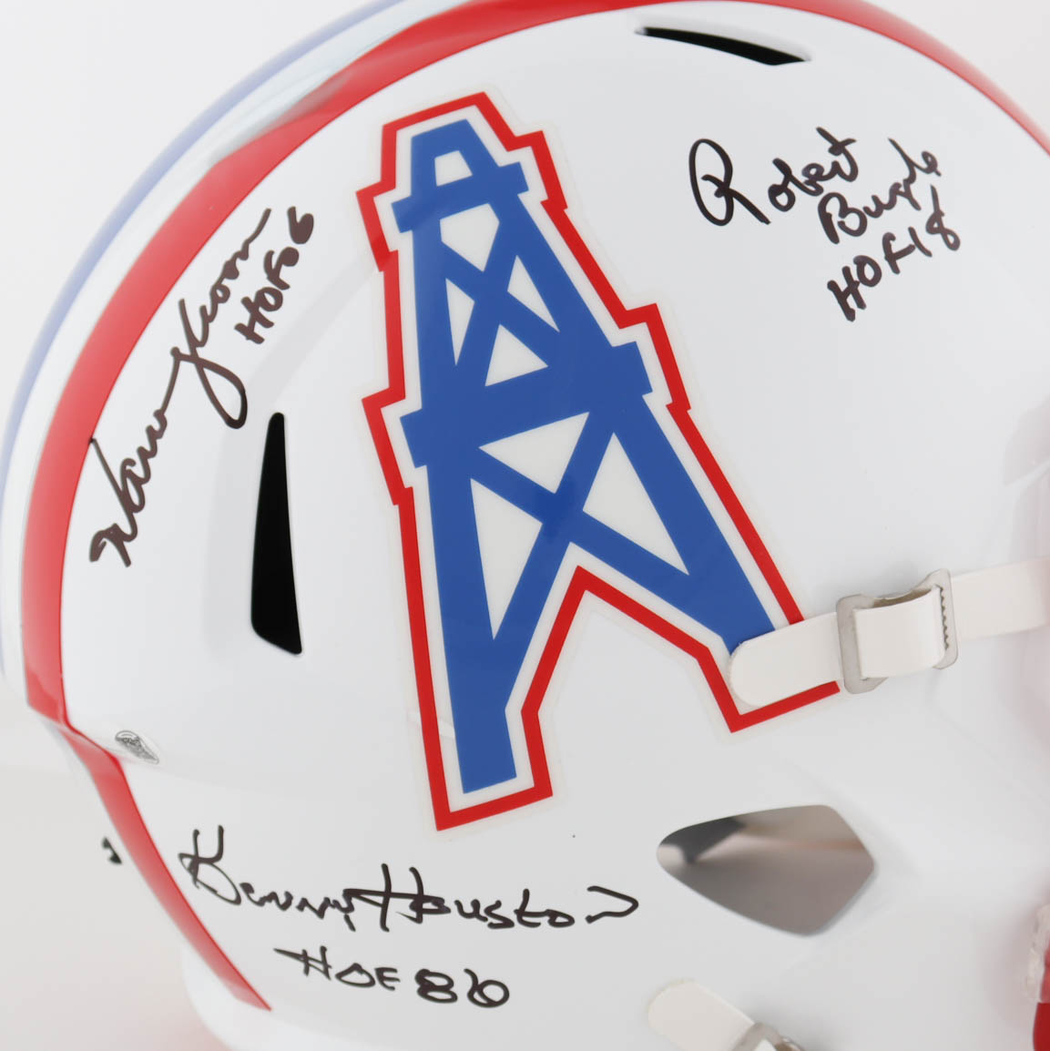 Riddell Houston Oilers full-size replica Speed helmet. Hand-signed and inscribed by Warren Moon (HOF), Ken Houston (HOF) and Robert Brazile (HOF)