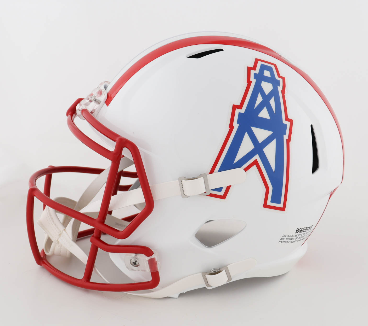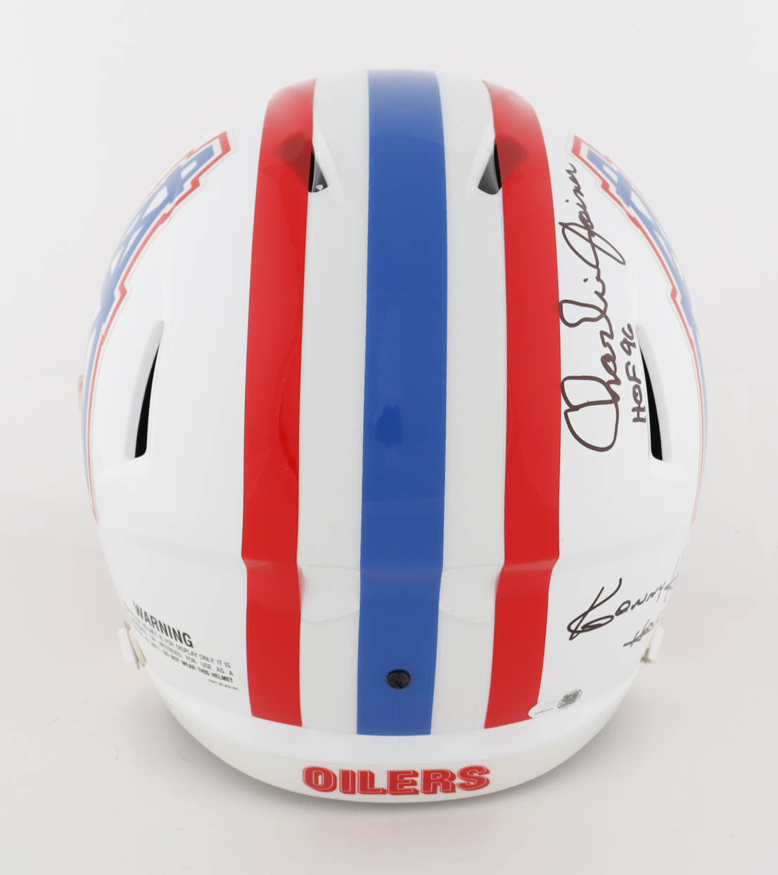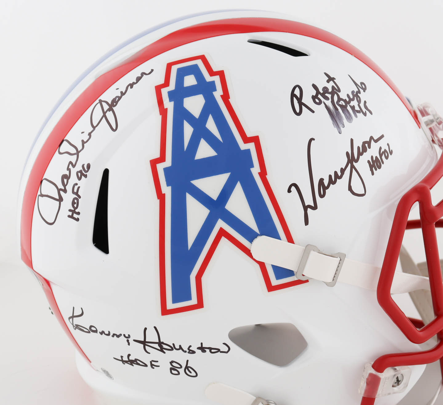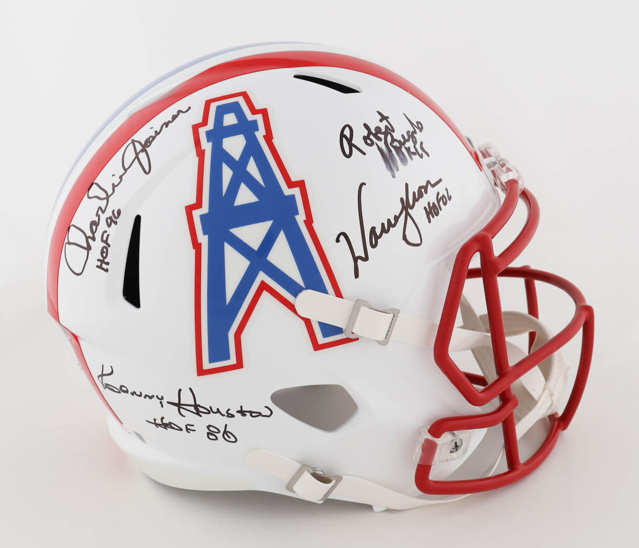 Riddell Houston Oilers full-size replica speed helmet. Hand-signed and inscribed by (4) with Ken Houston (HOF), Charlie Joiner (HOF), Robert Brazile (HOF) and Warren Moon (HOF). Please note, the Robert Brazile signature is smudged.