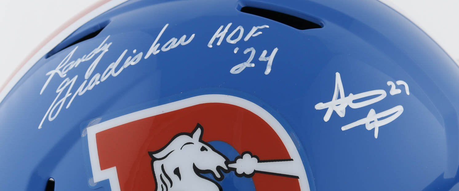Riddell Denver Broncos full-size throwback replica helmet. Hand-signed and inscribed by Randy Gradishar (HOF) and Steve Atwater (HOF).