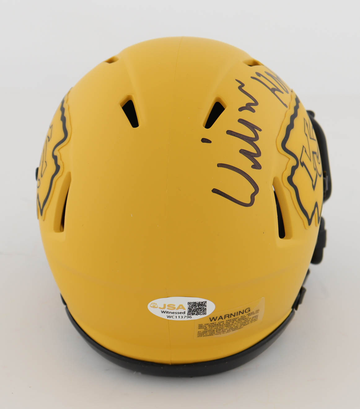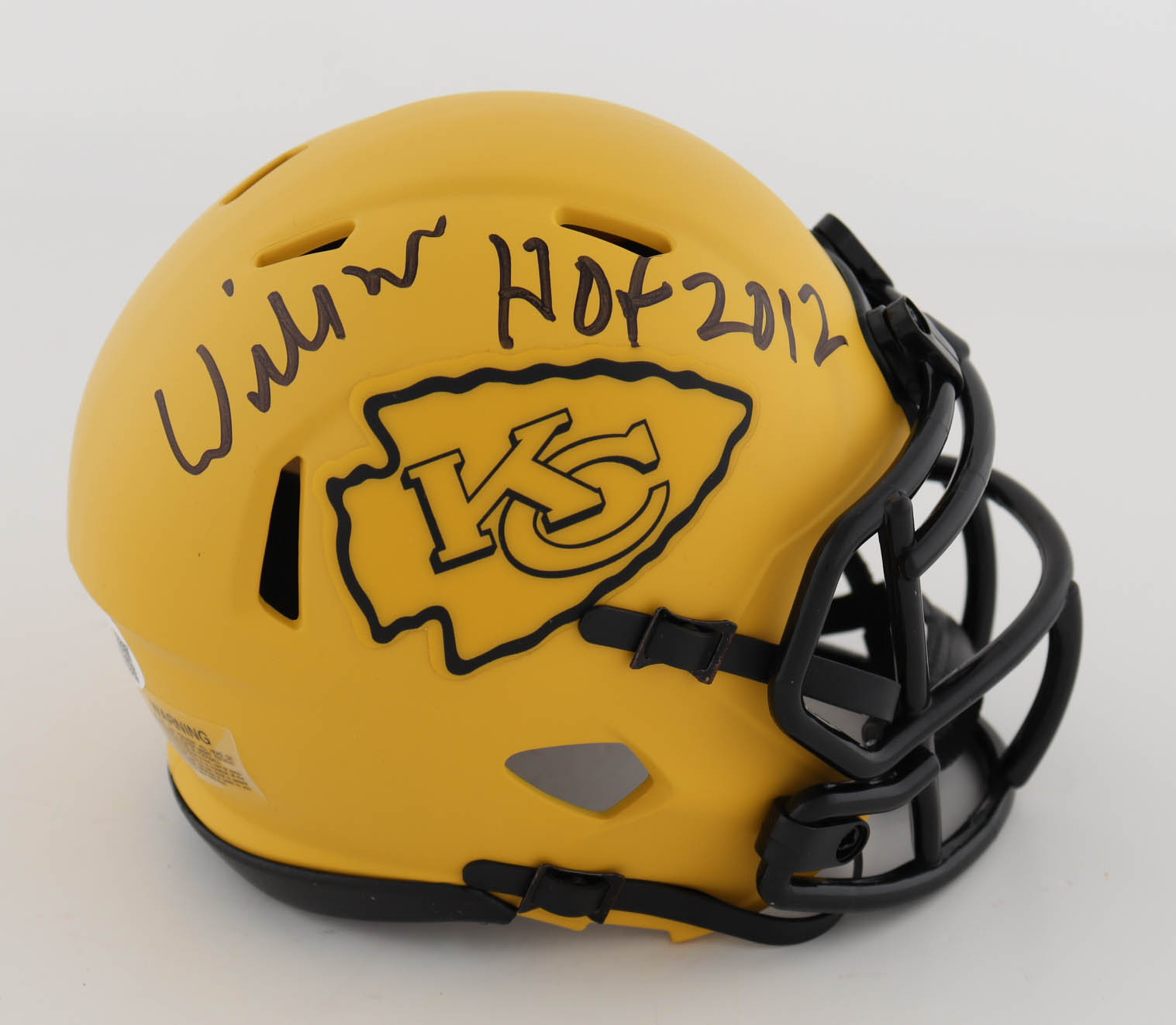Riddell Kansas City Chiefs Rave Alternate Speed mini helmet. Hand-signed and inscribed by Willie Roaf (HOF).