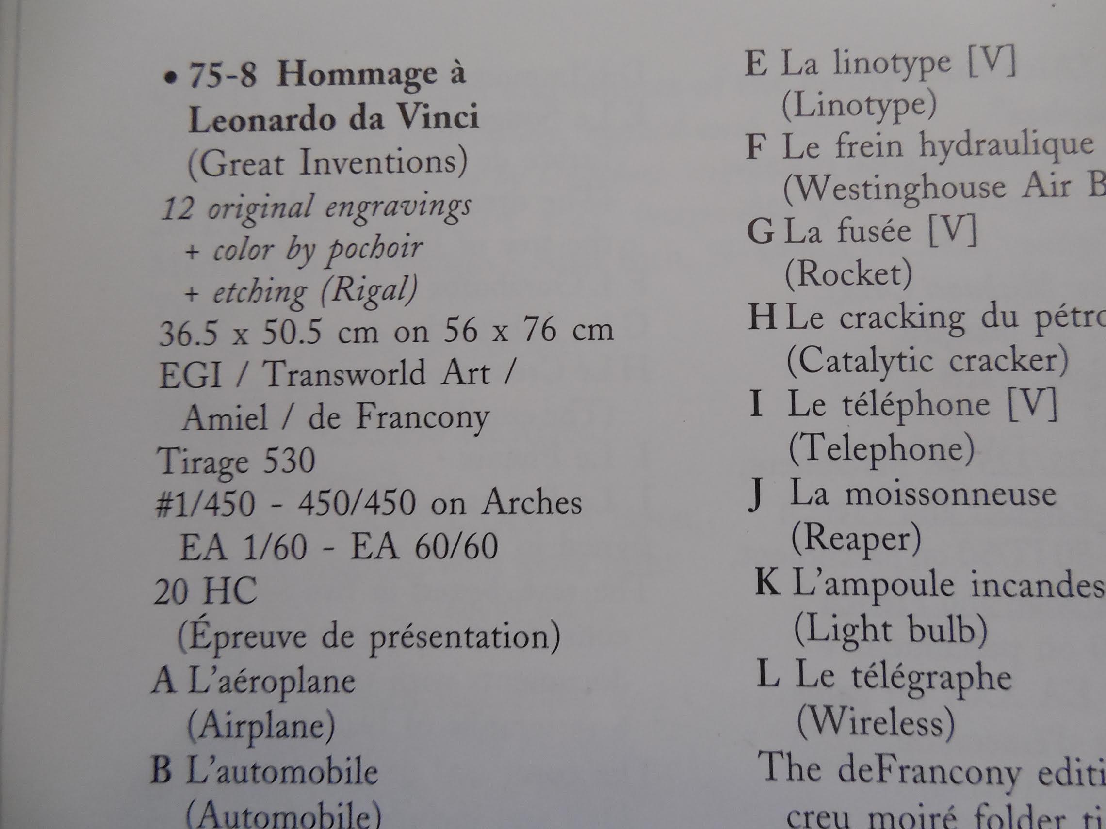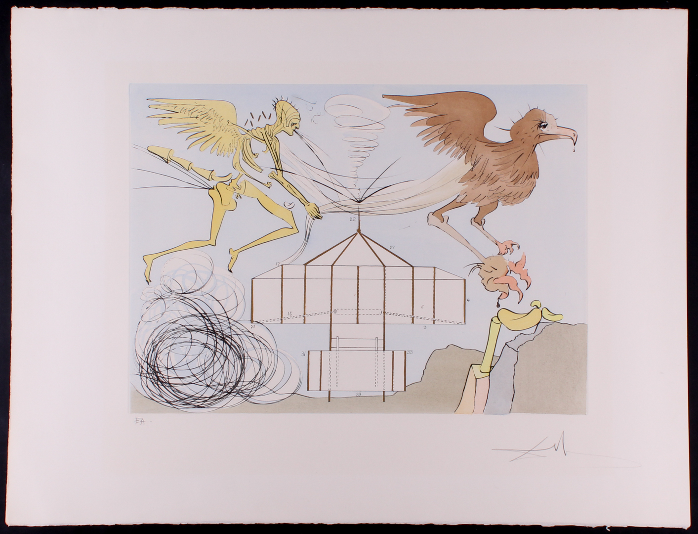 "L'aeroplane" from the suite "Hommage a Leonardo da Vinci", measures approximately 22" x 29" in size. Hand-signed in pencil by Salvador Dali. The piece is an artists proof and marked in pencil (EA).