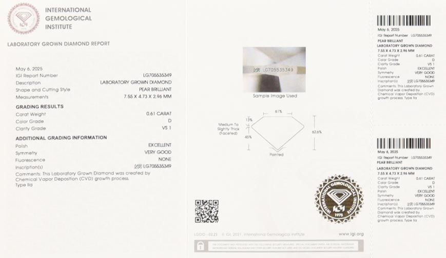 This piece includes paperwork from the International Gemological Institute (IGI).