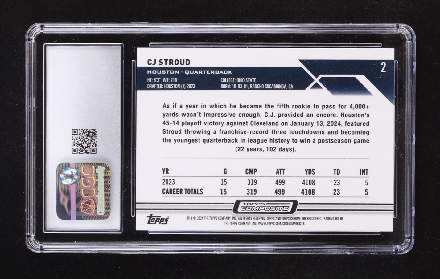 Card has been graded CGC 10. Please see photos for details regarding the condition of the card (Houston Texans).