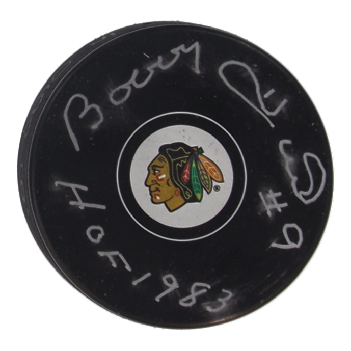 Bobby Hull Signed Blackhawks Logo Hockey Puck Inscribed "HOF 1983" (Fanatics)