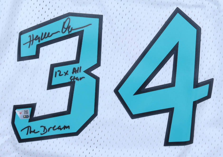 Authentic Mitchell & Ness jersey with everything pressed on, size M. Hand-signed and inscribed by Hakeem Olajuwon (Houston Rockets, HOF).