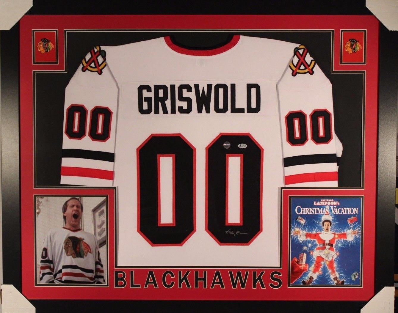 Custom framed jersey display measures 35" x 43" in size and features a Griswold jersey that has been hand signed in silver paint pen by Chevy Chase (Clark).