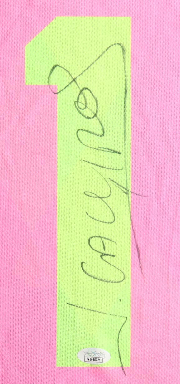 Sport Original jersey with everything printed on, size M. Hand-signed by Jorge Campos (UNAM). Please note, there is slight smudging on the signature.
