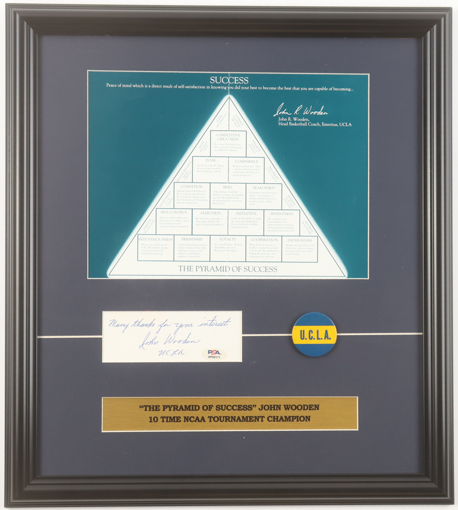 John Wooden Signed Custom Framed "Pyramid of Success" Signed Cut Display Inscribed "Many Thanks for Your Interest" (PSA)