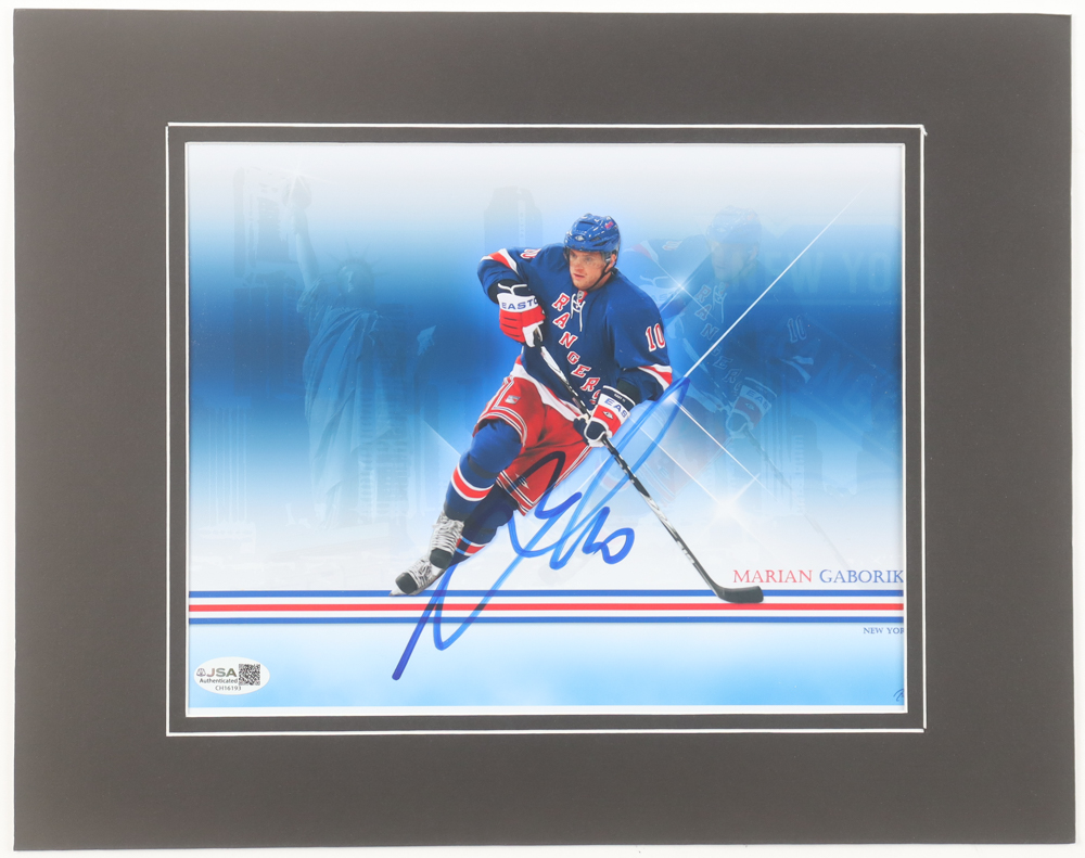 Custom matted photo display measures 11" x 14" in size. Features a photo that has been hand-signed by Marian Gaborik (New York Rangers). Please note, there is some edge and corner wear on the matting.