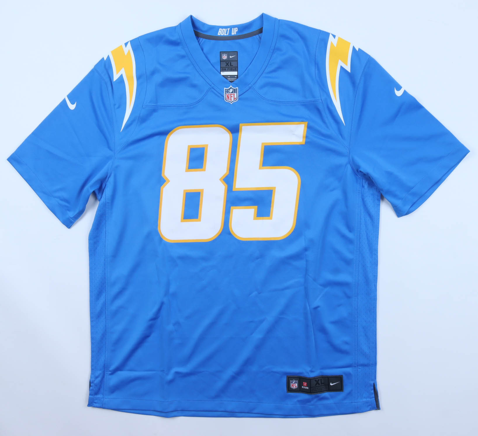 Nike jersey with everything pressed on, size XL. Hand-signed by Antonio Gates (Los Angeles Chargers, HOF). Please note, there is staining on the front number. See photos regarding the condition of the item.