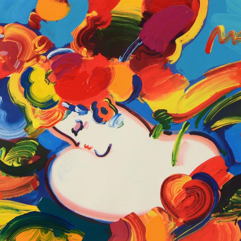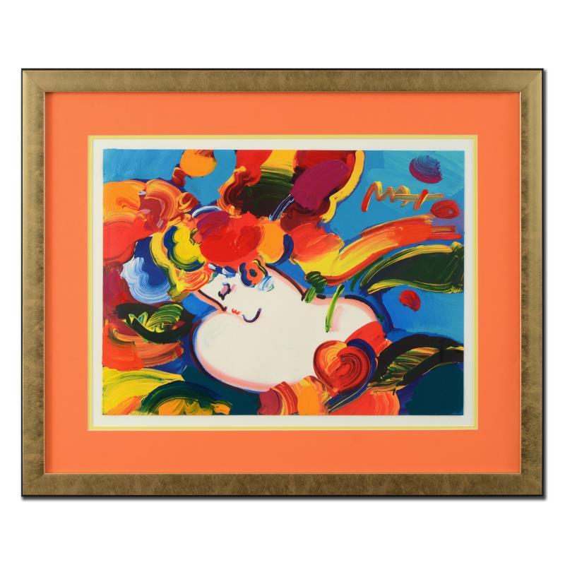 "Woman in Love" is a one-of-a-kind acrylic mixed media on paper, hand signed by Peter Max! This Piece Comes Custom Framed! Includes Certificate of Authenticity from Peter Max Studios! Measures approx. 35" x 29" (with frame), 24" x 17.5" (image).