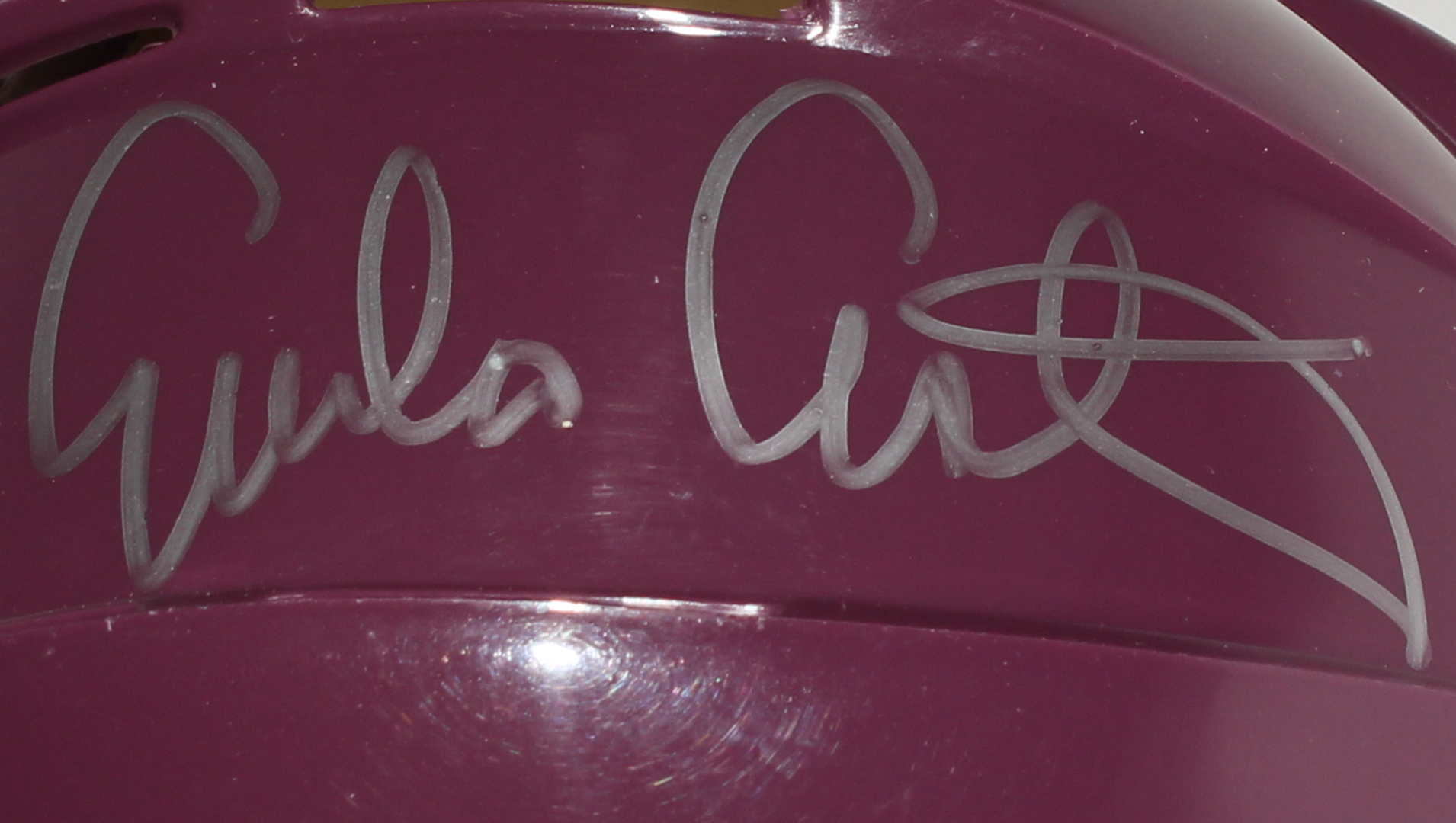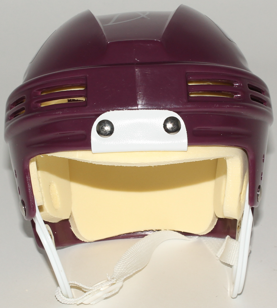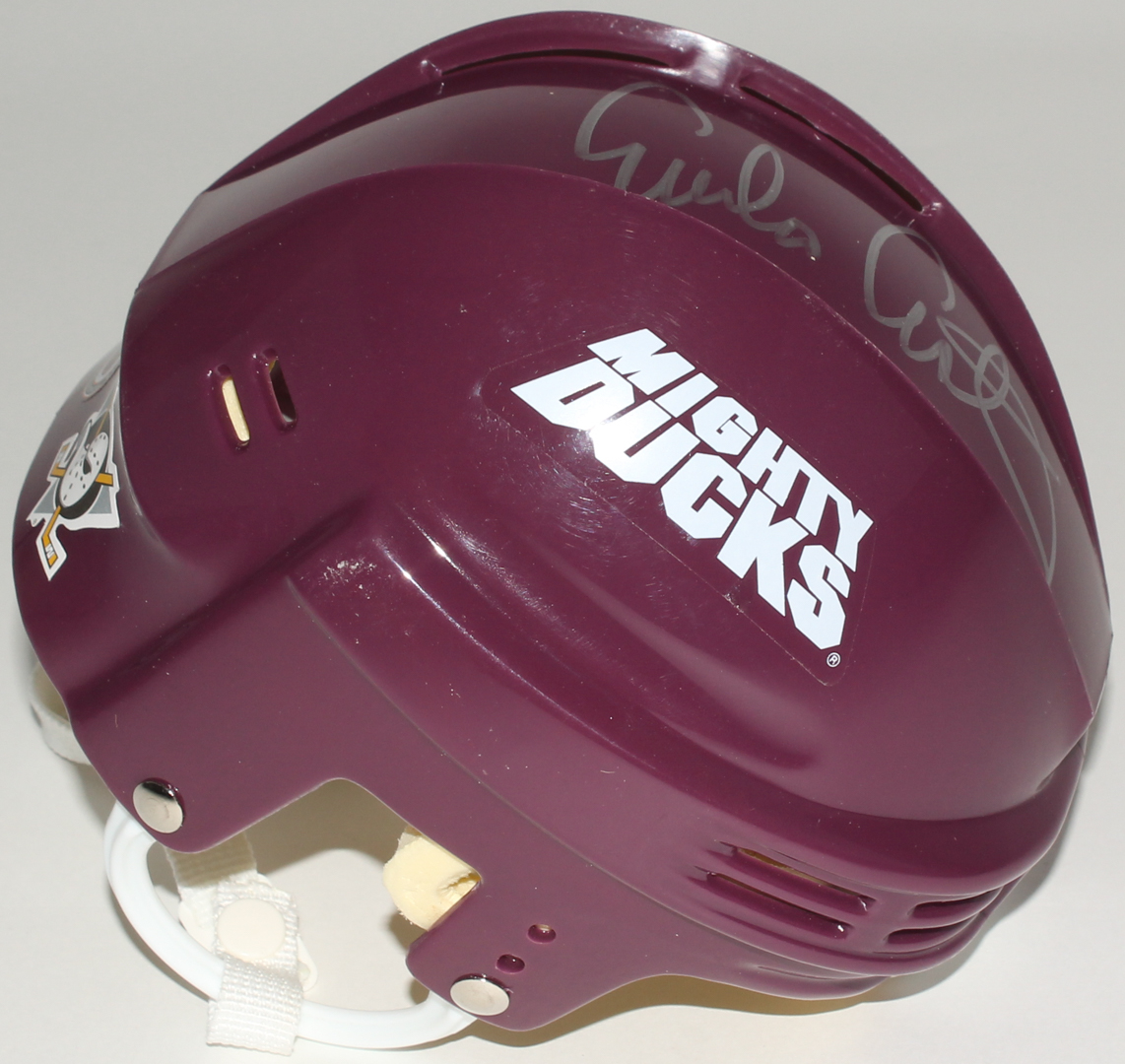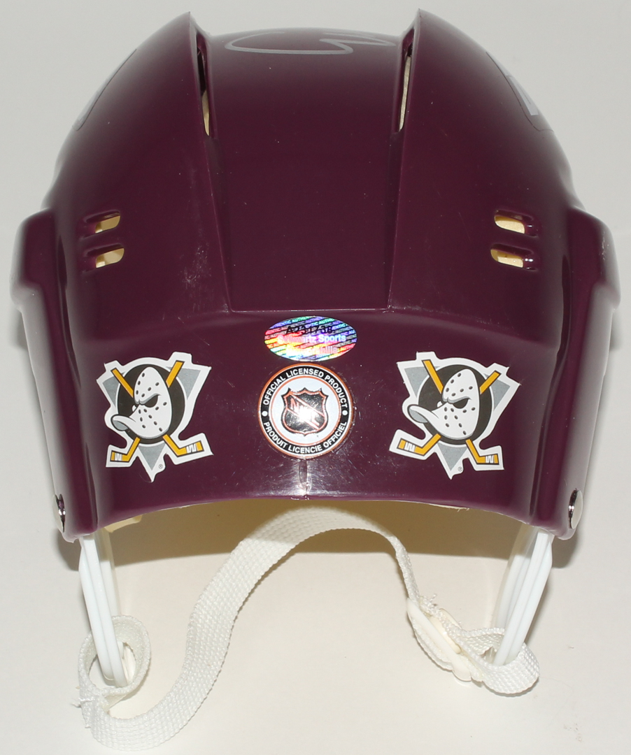 NHL Mighty Ducks mini-helmet. Hand-signed in silver paint pen by Emilio Estevez.
