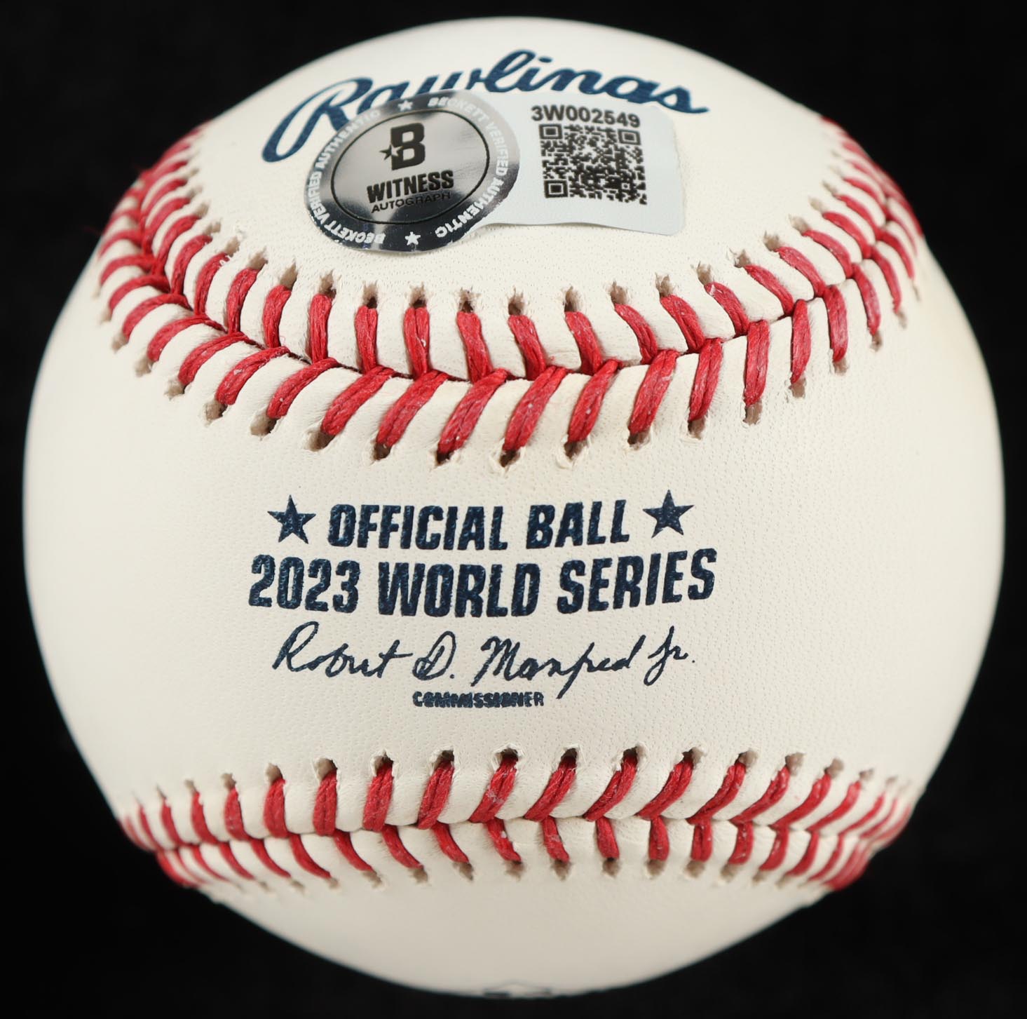 Rawlings Official 2023 World Series baseball. Hand-signed and inscribed by Marcus Semien (Texas Rangers).