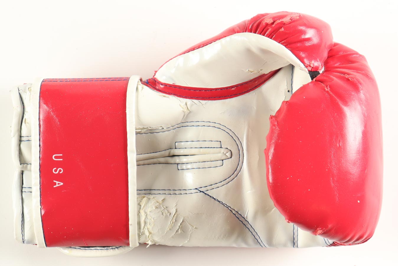 USA Everlast boxing glove has been hand-signed by Mike Tyson. (HOF). Please note, glass case was broken in shipping. The stand and wrist wraps are included as shown in the listing.