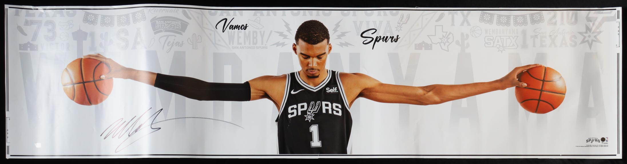 Poster measures 21" x 85" in size and has been hand-signed by Victor Wembanyama (San Antonio Spurs). Please note, poster has small creases in various spots.