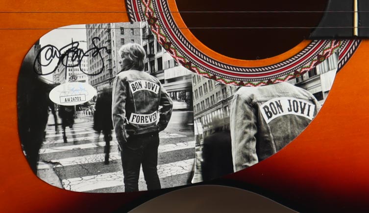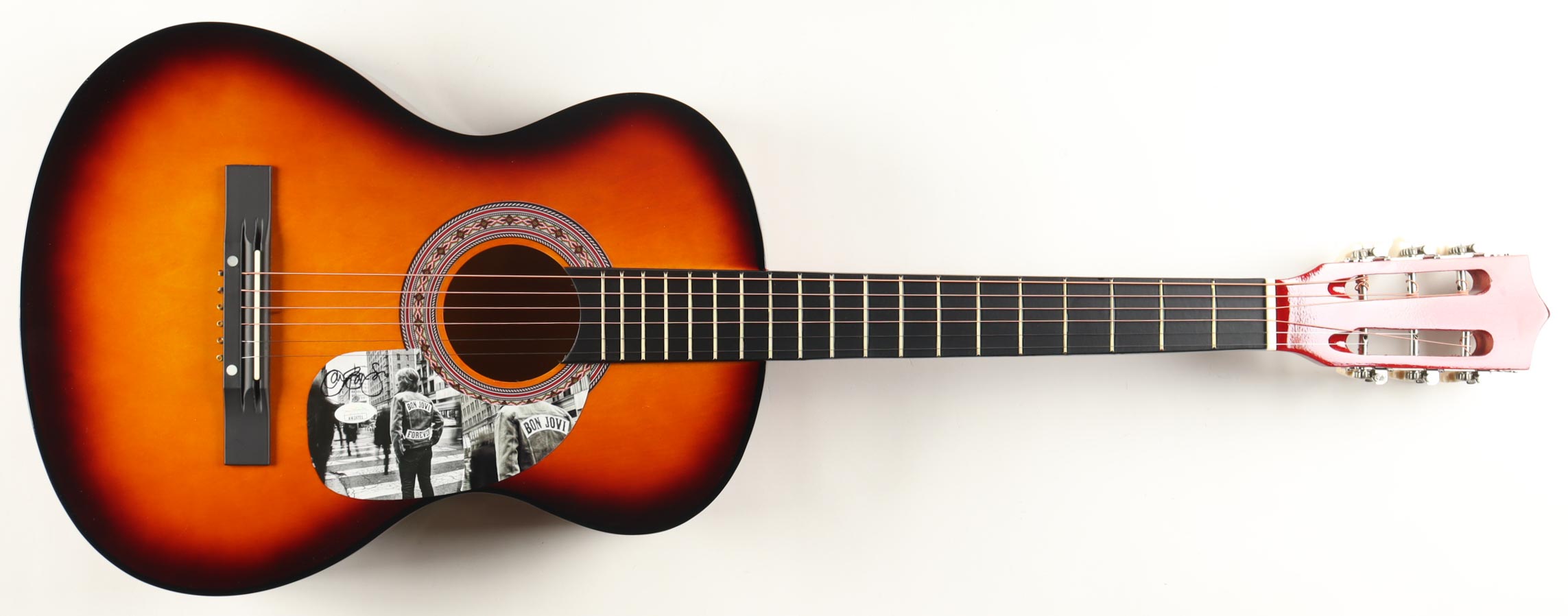 Acoustic guitar measures approximately 38" in length and has been hand-signed on a CD cover that has been repurposed as a pick-guard by Jon Bon Jovi.