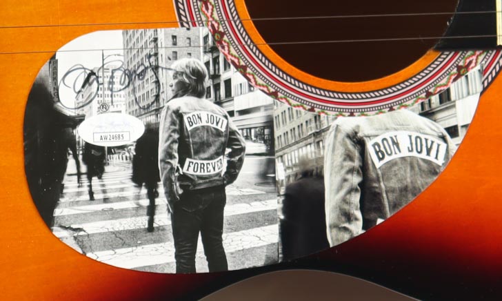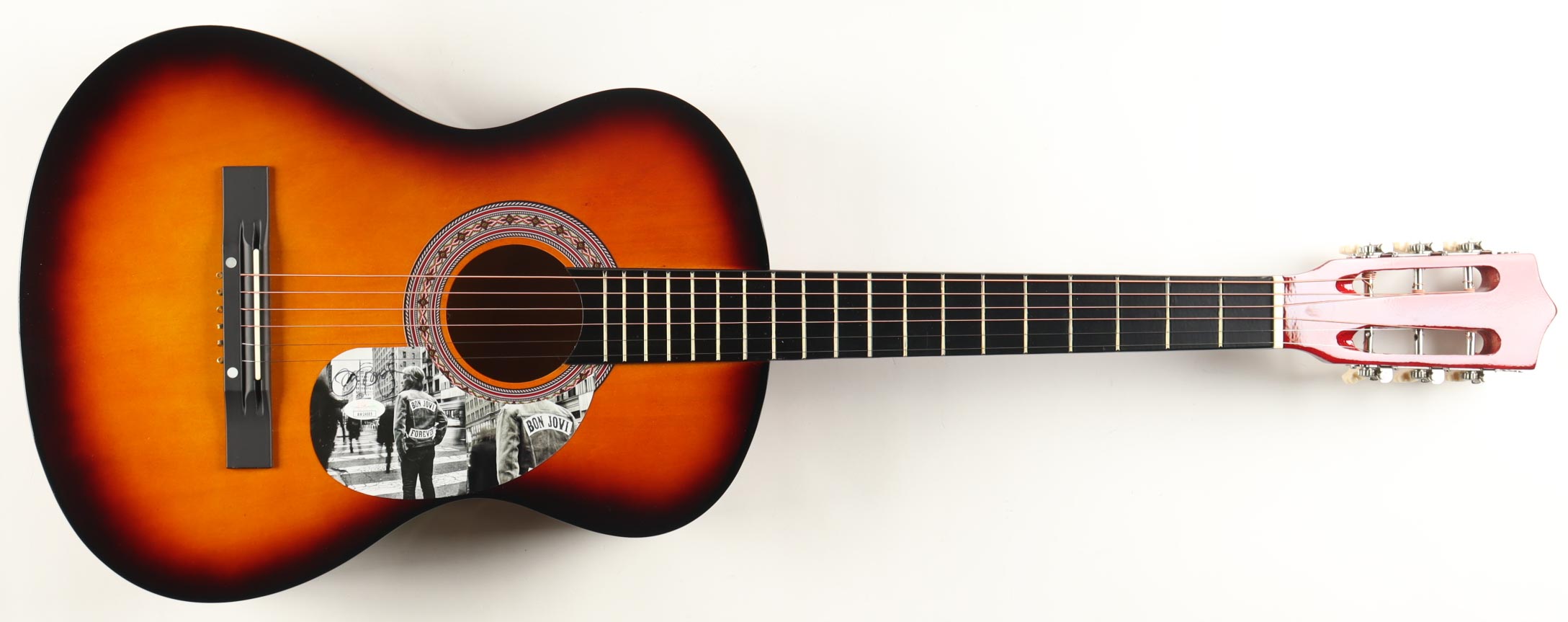 Acoustic guitar measures approximately 38" in length and has been hand-signed on a CD cover that has been repurposed as a pick-guard by Jon Bon Jovi.