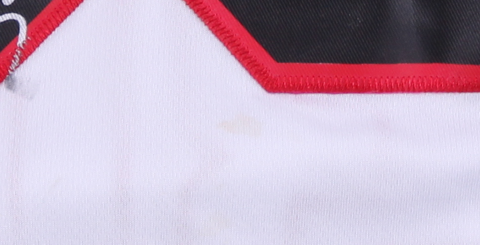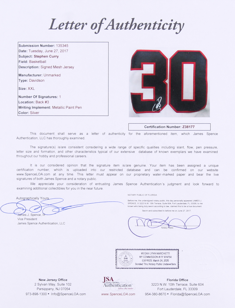 Custom on-court style jersey. Everything is sewn on, size XXL. Hand-signed in silver paint pen by Stephen Curry (Warriors). Please note, there is minor staining below the back numbers of the jersey.