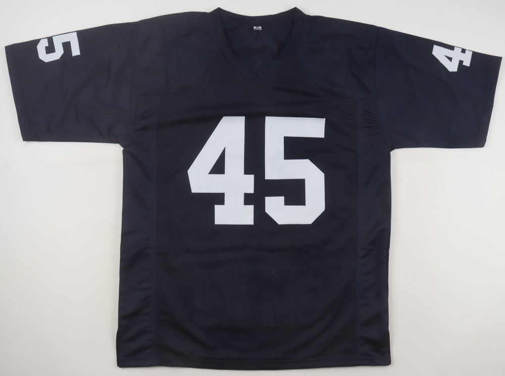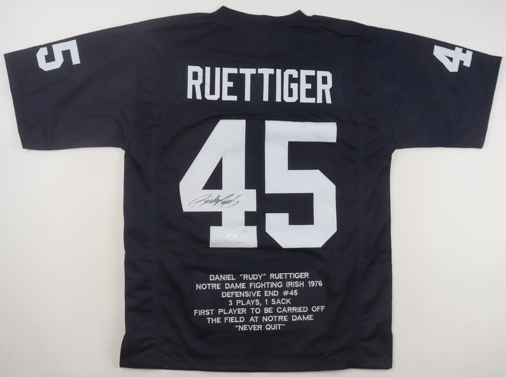 Custom jersey. Everything is sewn on, size XL. Hand-signed by Rudy Ruettiger. Please note, Ruettiger's career highlights have been custom stitched onto the back of the jersey below the reverse numbers.