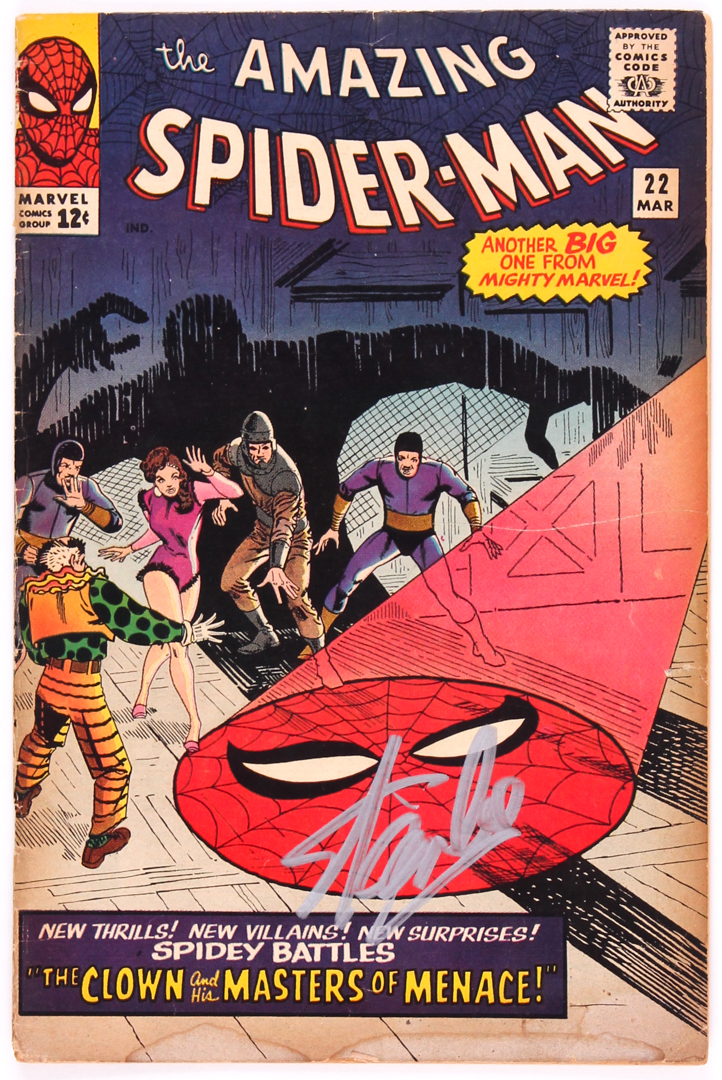 Vintage 1965 "The Amazing Spider-Man" Issue #22 Marvel Comic Book. Hand-signed on the front cover in silver paint pen by Stan Lee. Please note, there is a tear in the center of the cover.
