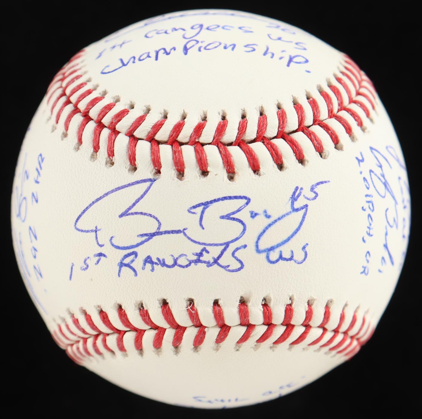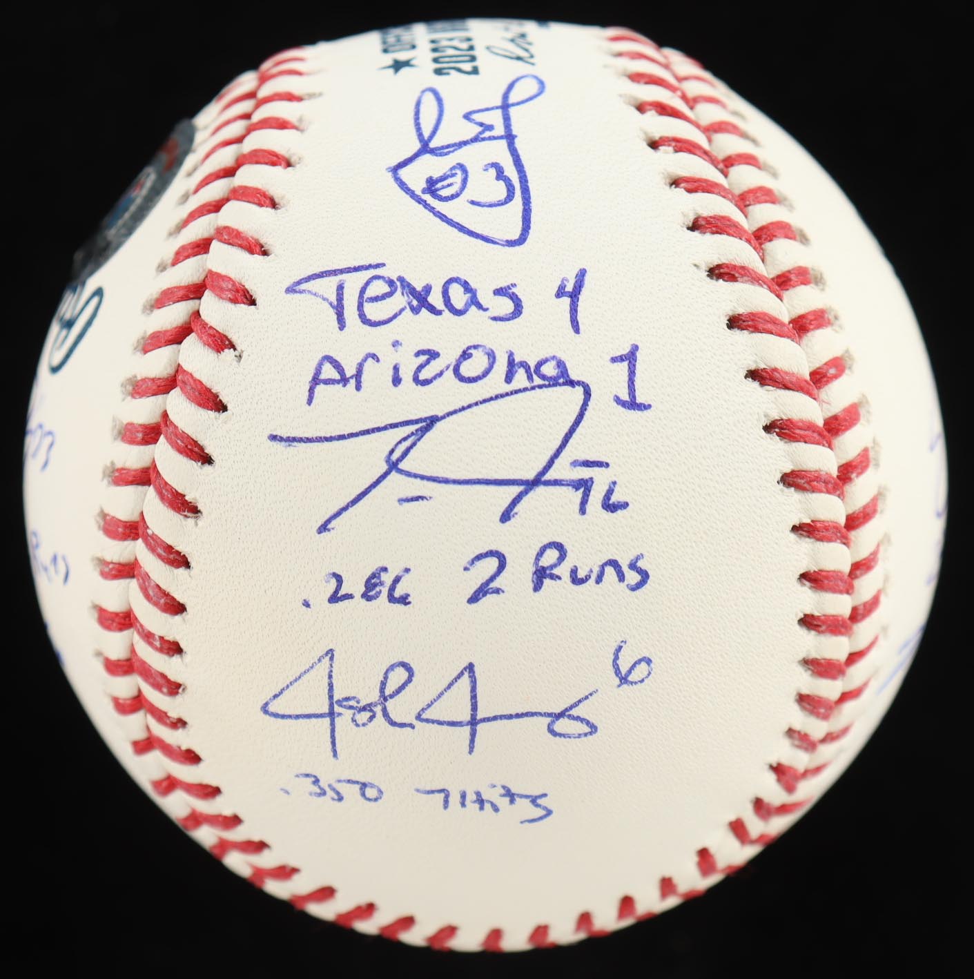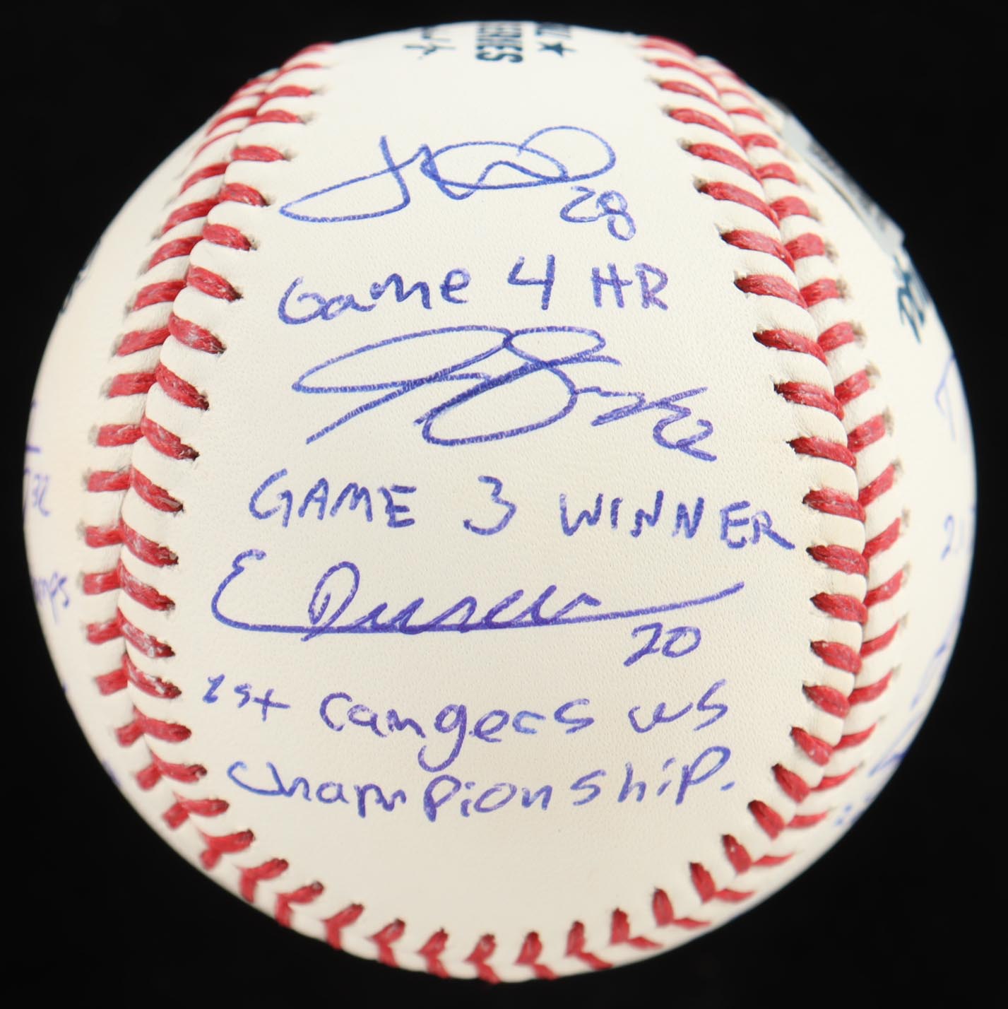 Rawlings Official 2023 World Series baseball. Hand-signed and inscribed by (11) including, Evan Carter, Josh Jung, Bruce Bochy, Josh Sborz, Dane Dunning, Cody Bradford, Leody Taveras, Travis Jankowski, Jonah Heim, Jon Gray, and Ezequiel Duran (Texas Rangers).