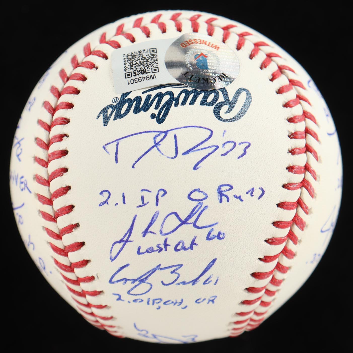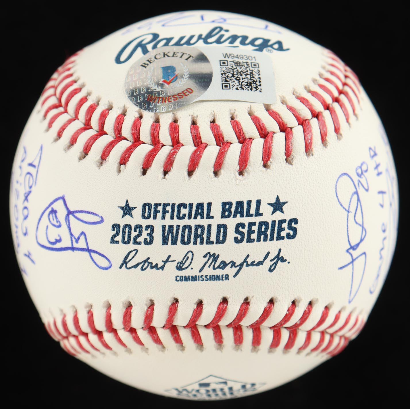 2023 World Series Baseball Signed by (11) with Evan Carter, Josh Jung, Bruce Bochy, Josh Sborz with Multiple Inscriptions (Beckett)