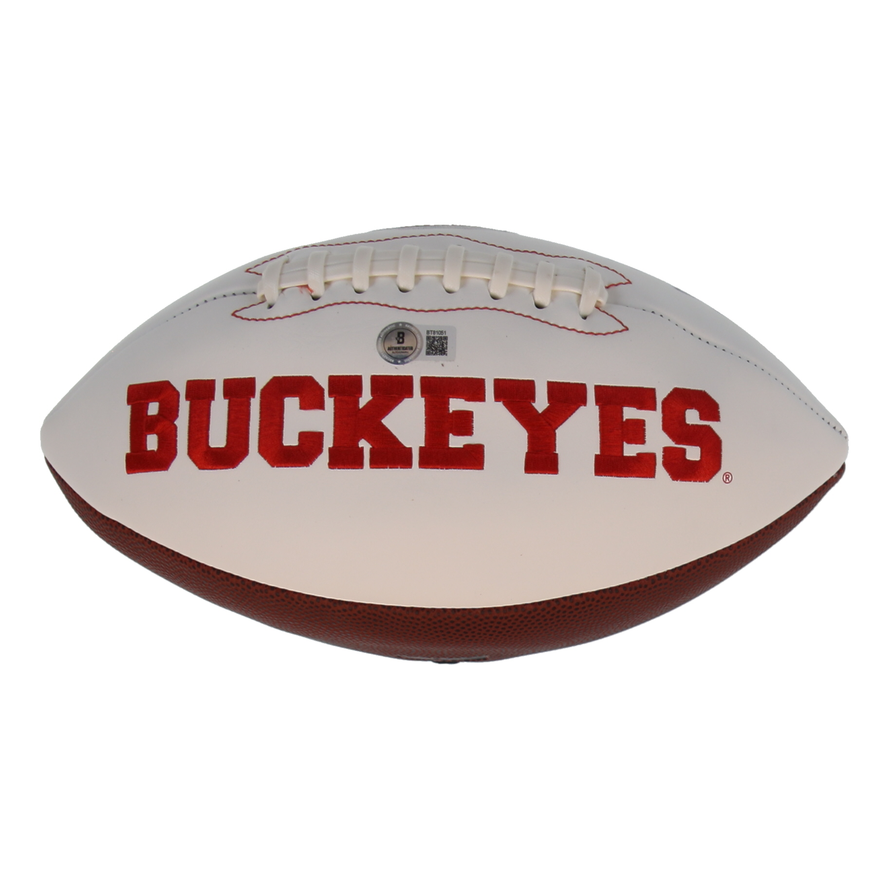 Ohio State Buckeyes logo football. Hand-signed by Justin Fields. Please note, the signature ink has bled.