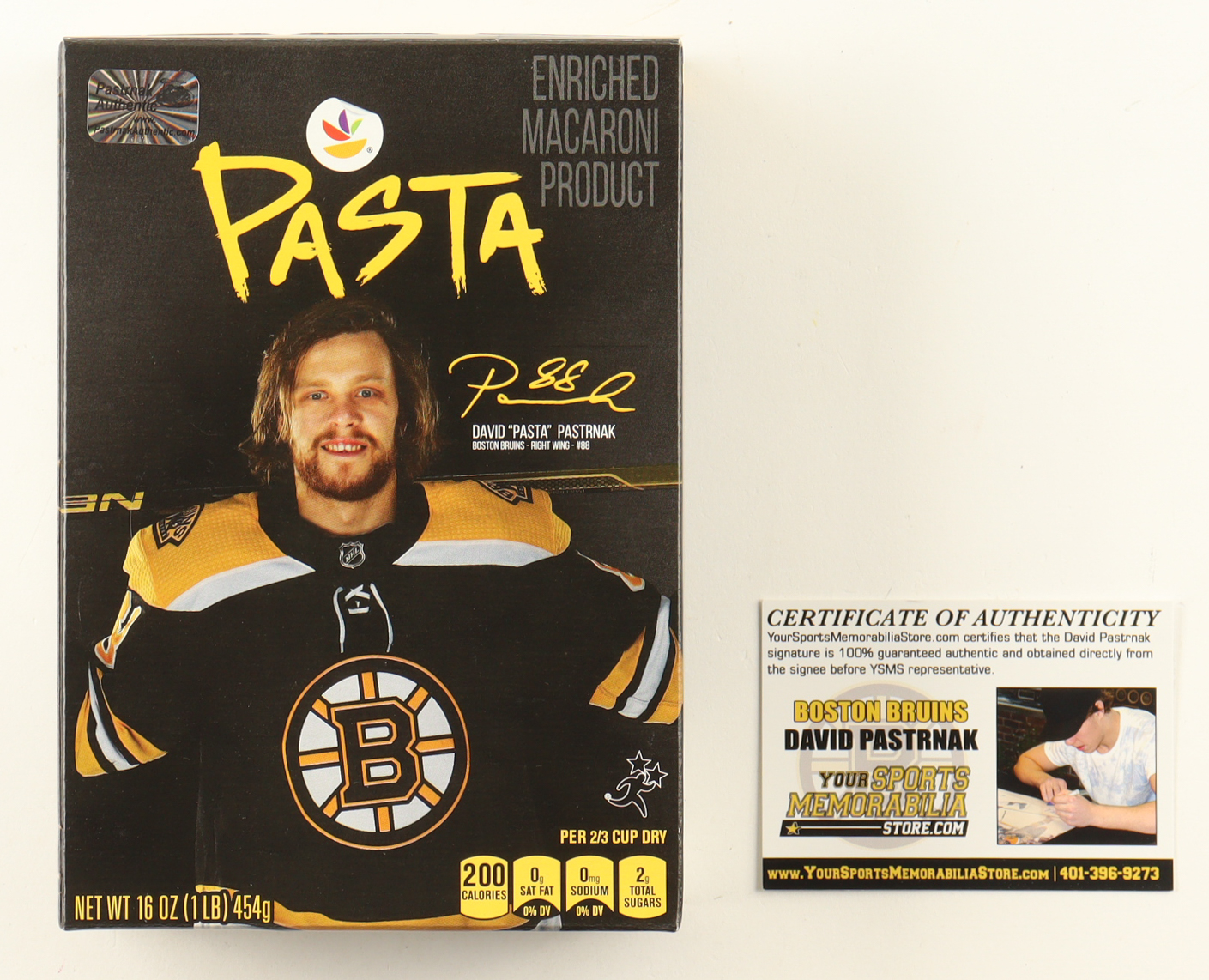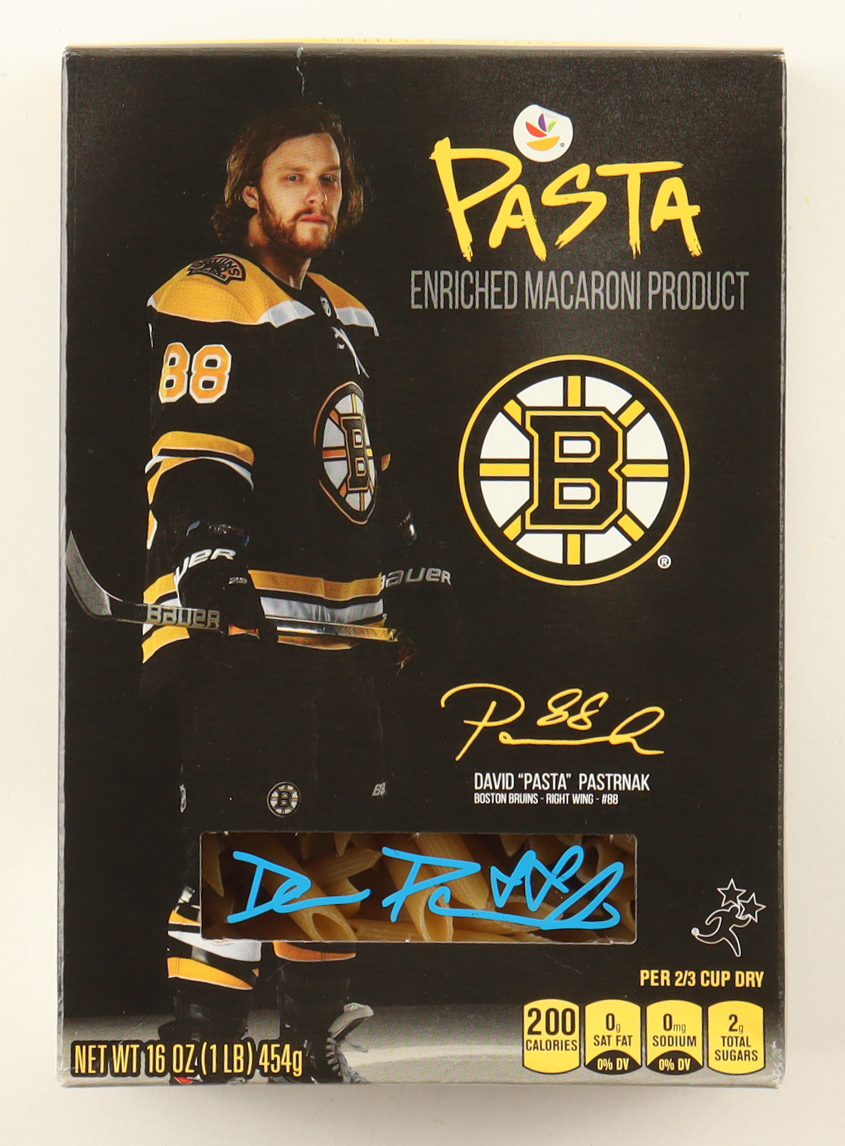 Unopened 16oz. Macaroni Collector's Edition Pasta Box. Hand-signed by David Pastrnak (Boston Bruins). Please note, there is edge wear and some creasing on the original packaging.