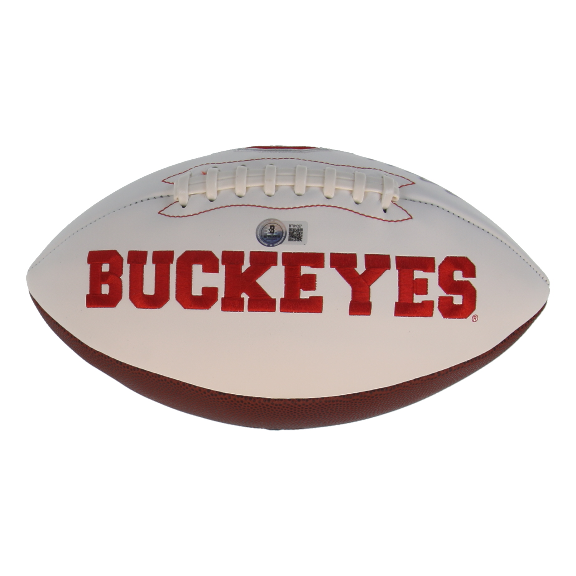 Ohio State Buckeyes logo football. Hand-signed by Justin Fields. Please note there is staining below the Ohio State logo and the signature ink has bled.