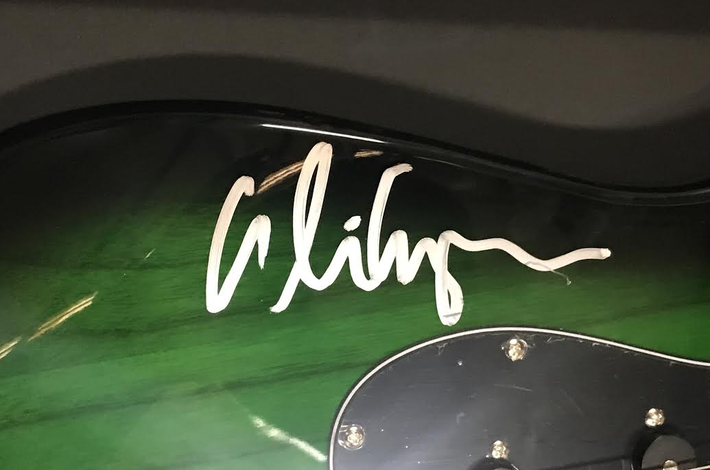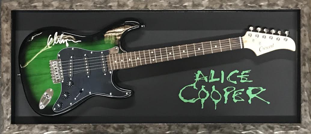 Custom framed display measures 17.5" x 41.5" in size and features a guitar that has been hand-signed in silver paint pen by Alice Cooper.
