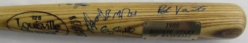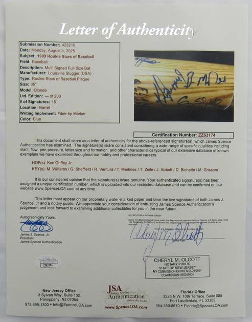 Louisville Slugger baseball bat has been hand-signed by (16) 1989 Rookie Stars of Baseball including Ken Griffey Jr., Gary Sheffield, and Matt Williams!