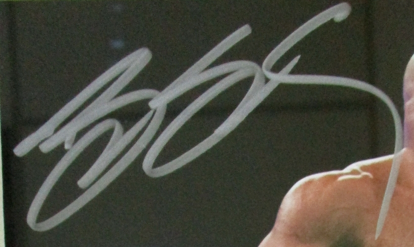 Custom framed photo display measures 13" x 16" in size and features a photo that has been hand signed in silver paint pen by Bill Goldberg.