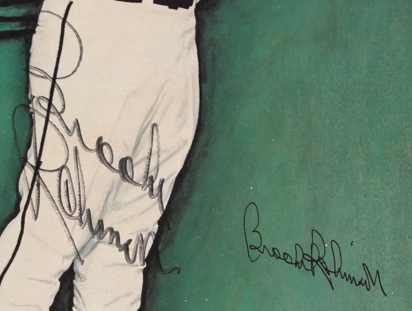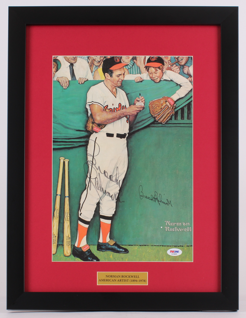 Custom frame measures approximately 15.5" x 20.5" in size. Features a print from Norman Rockwell (D. 1978) hand-signed in black ink pen by Brooks Robinson (HOF).