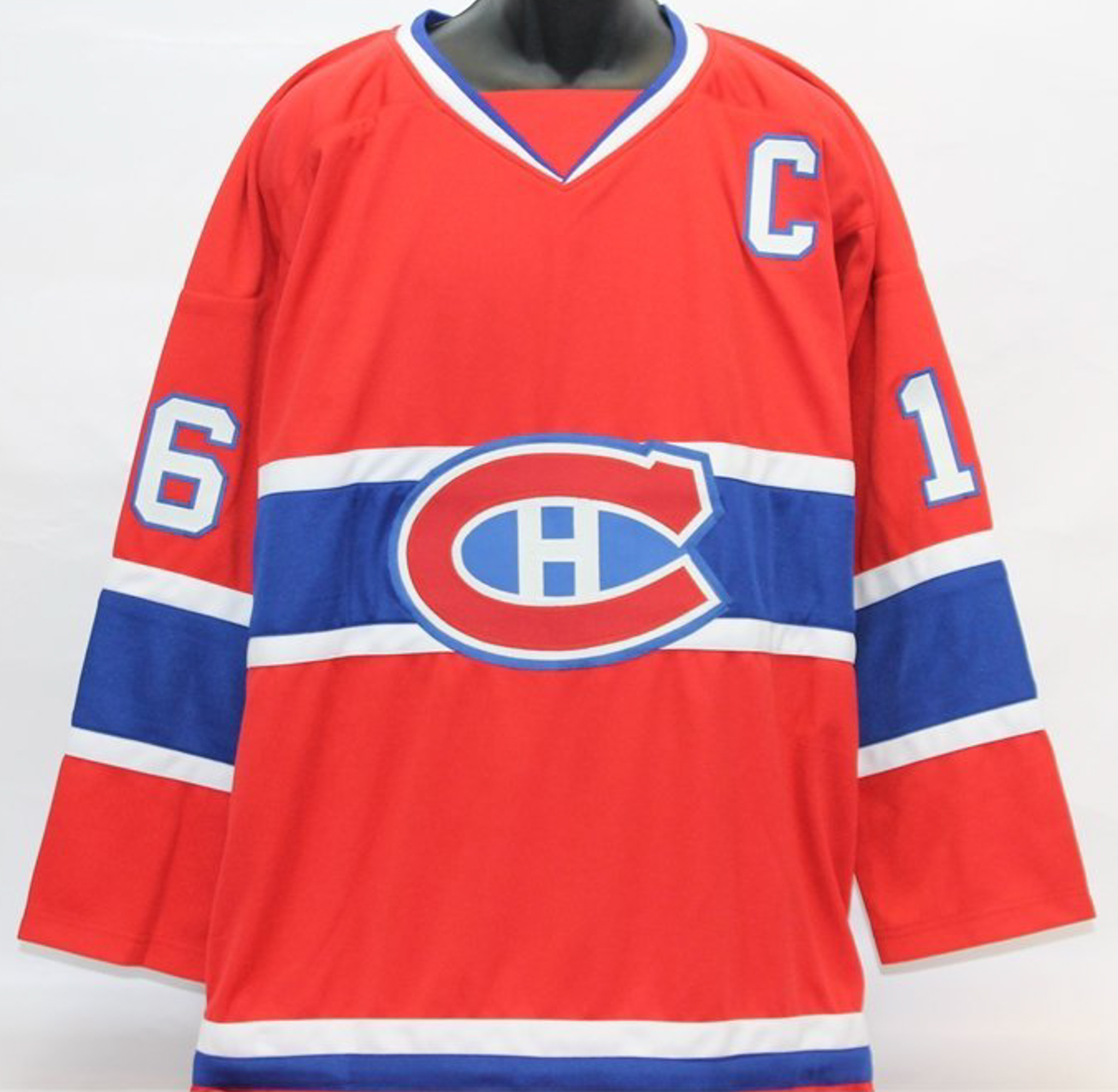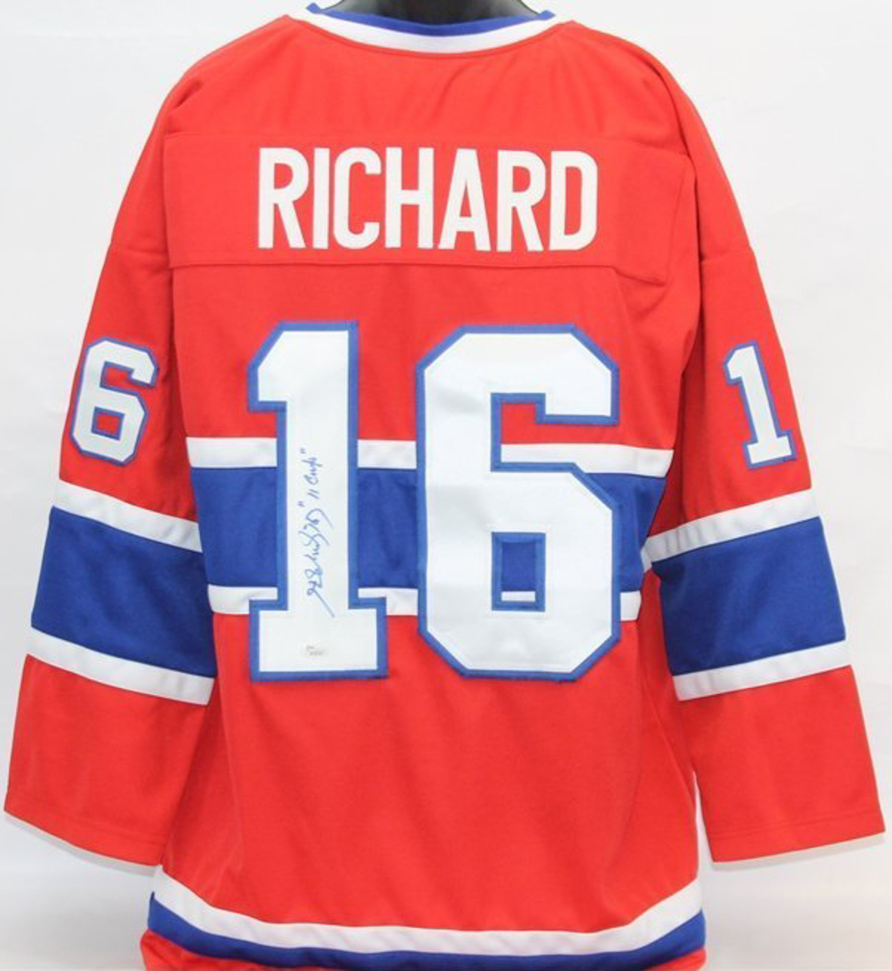 Custom on-ice style jersey. Everything is sewn on, size XL. The jersey has been hand-signed in blue felt-tip pen by Henri Richard (HOF).