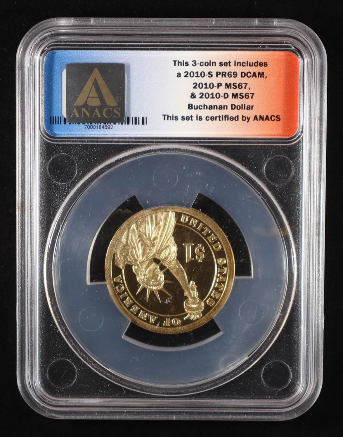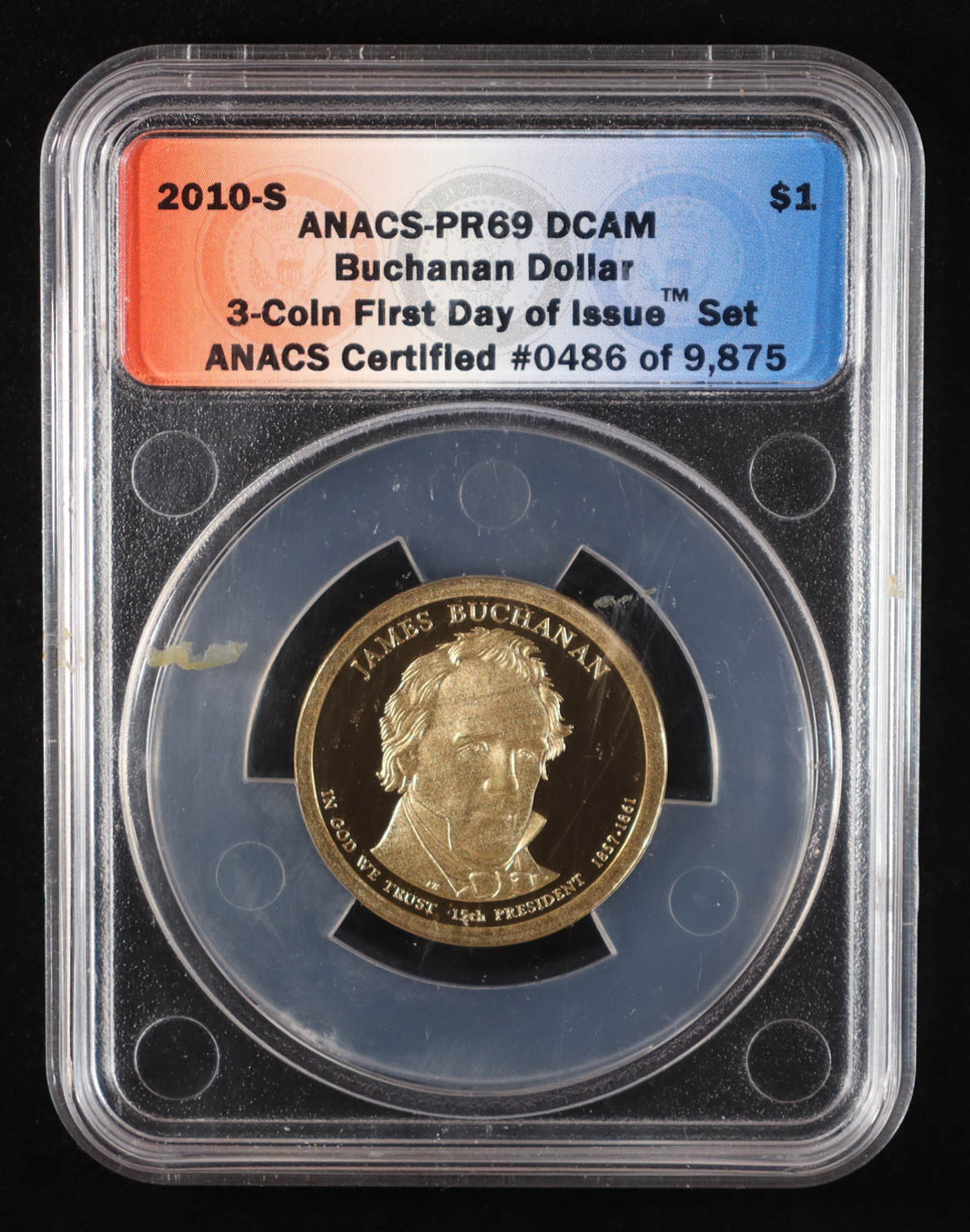2010-S U.S. Presidential Proof $1 Coin - James Buchanan 15th President, 3-Coin FDOI Set Certified #0486 of 9875 (ANACS PR69 DCAM)