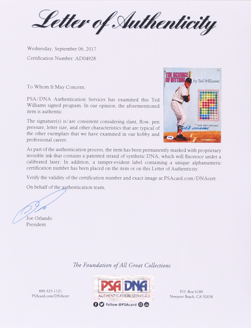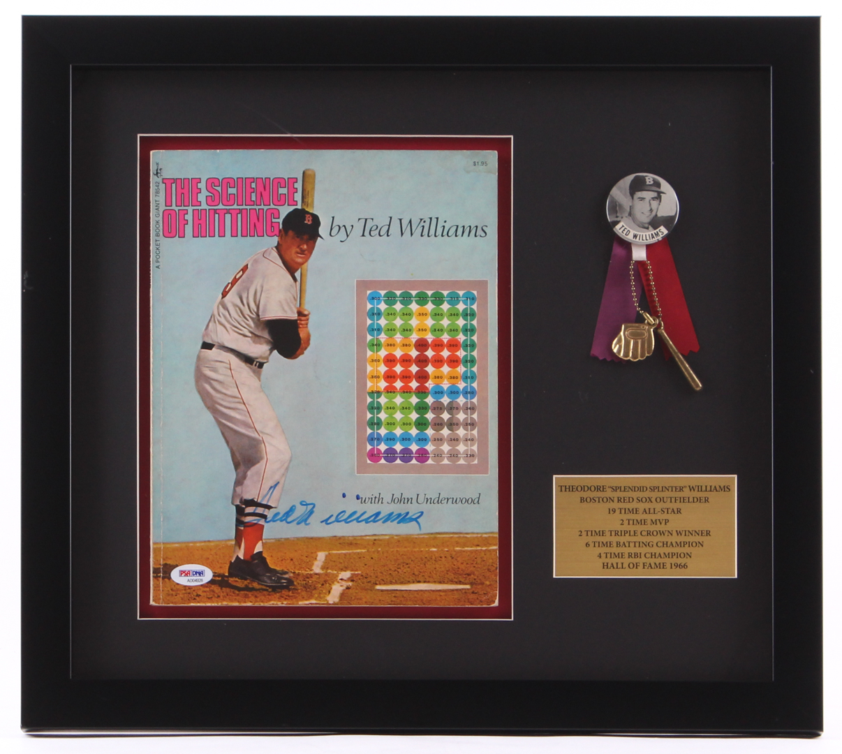 Ted Williams Signed "The Science of Hitting" 17x19 Custom Framed Book Display with Vintage 1950's Pin & Ribbon (PSA LOA)