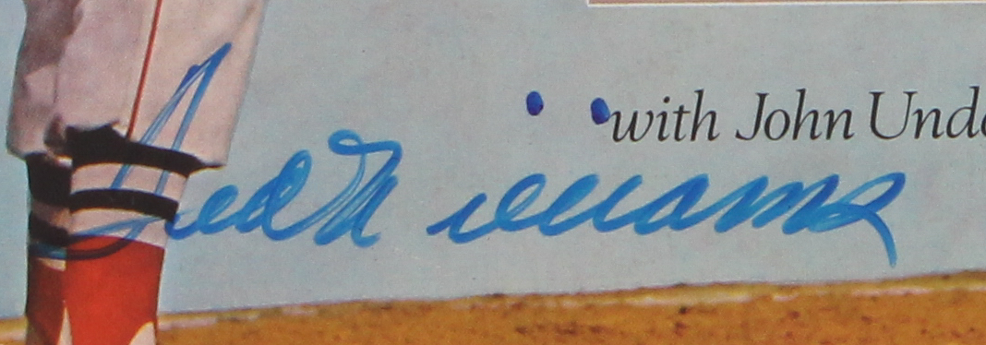 Custom framed display measures 17" x 19" in size and features a book that has been hand-signed in blue felt-tip pen by Ted Williams (D. 2002, HOF, Red Sox). The display also includes a vintage 1950's Williams pin and ribbon. Please note, the frame has minor surface damage its left side.
