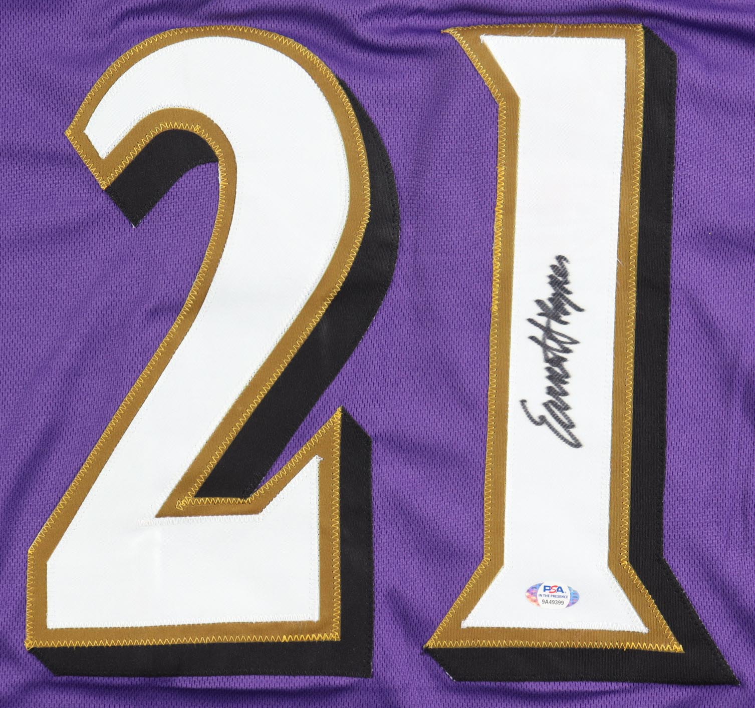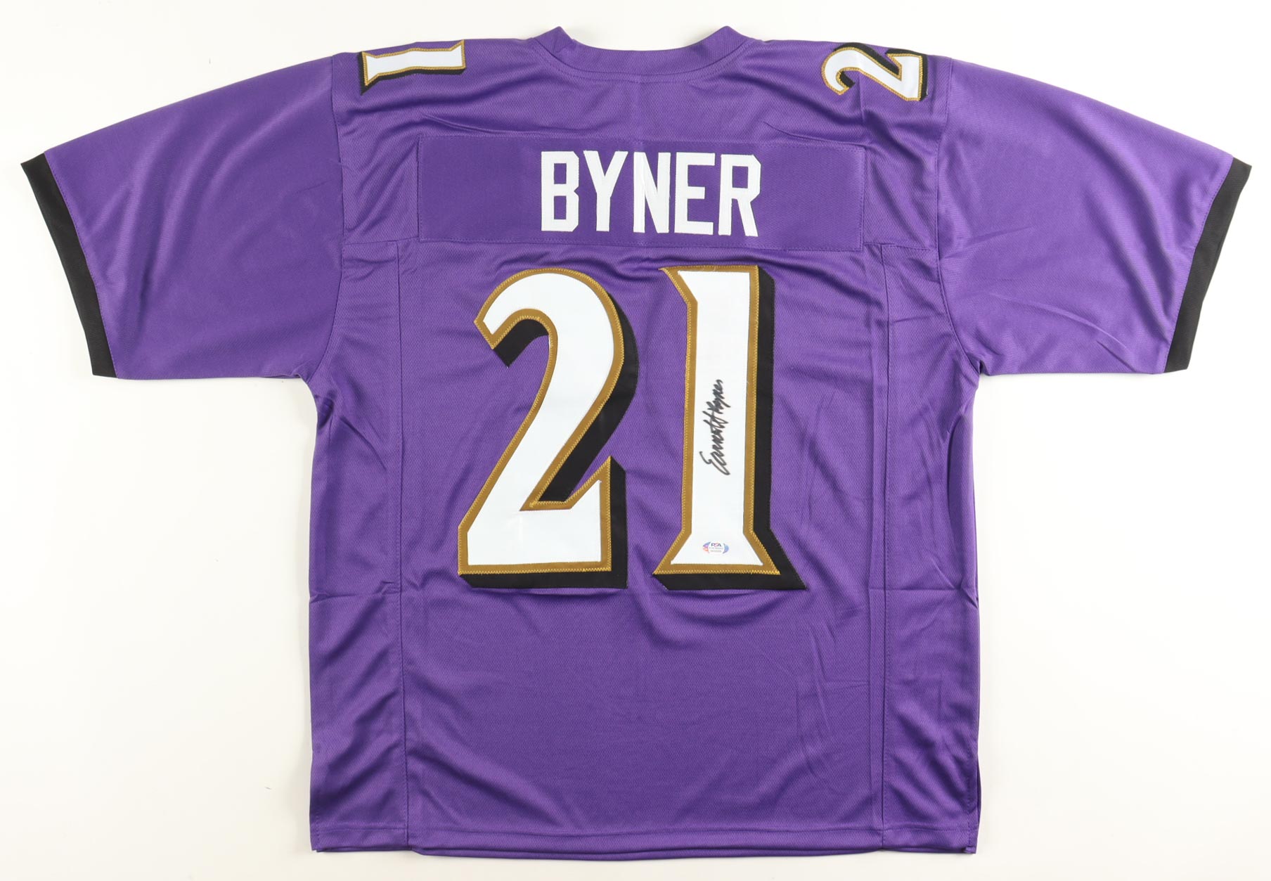 Custom jersey with everything sewn on, size XL. Hand-signed by Earnest Byner. Please note, the signature ink has bled.