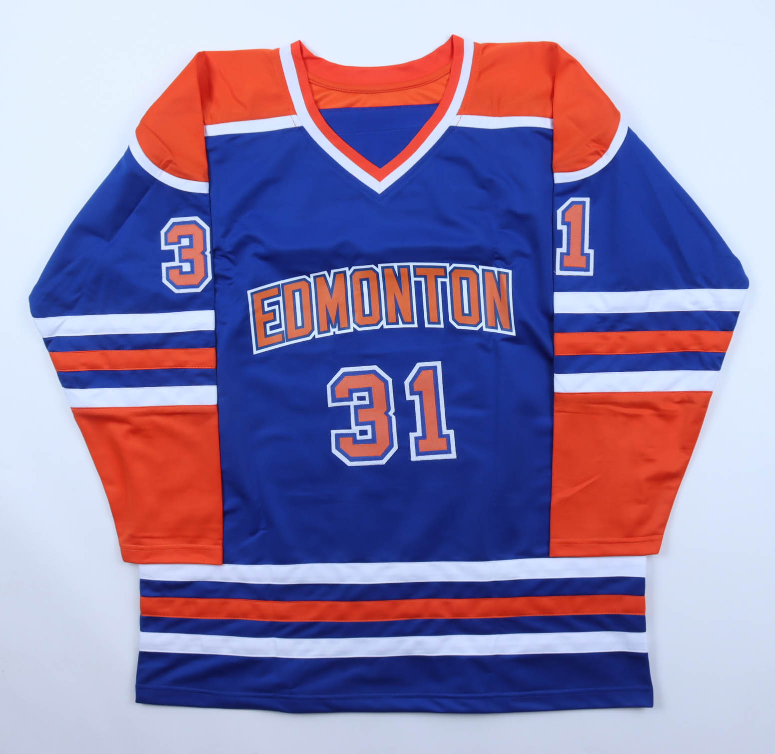 Custom jersey with everything sewn on, size XL. Has been hand-signed and inscribed by Grant Fuhr (HOF).