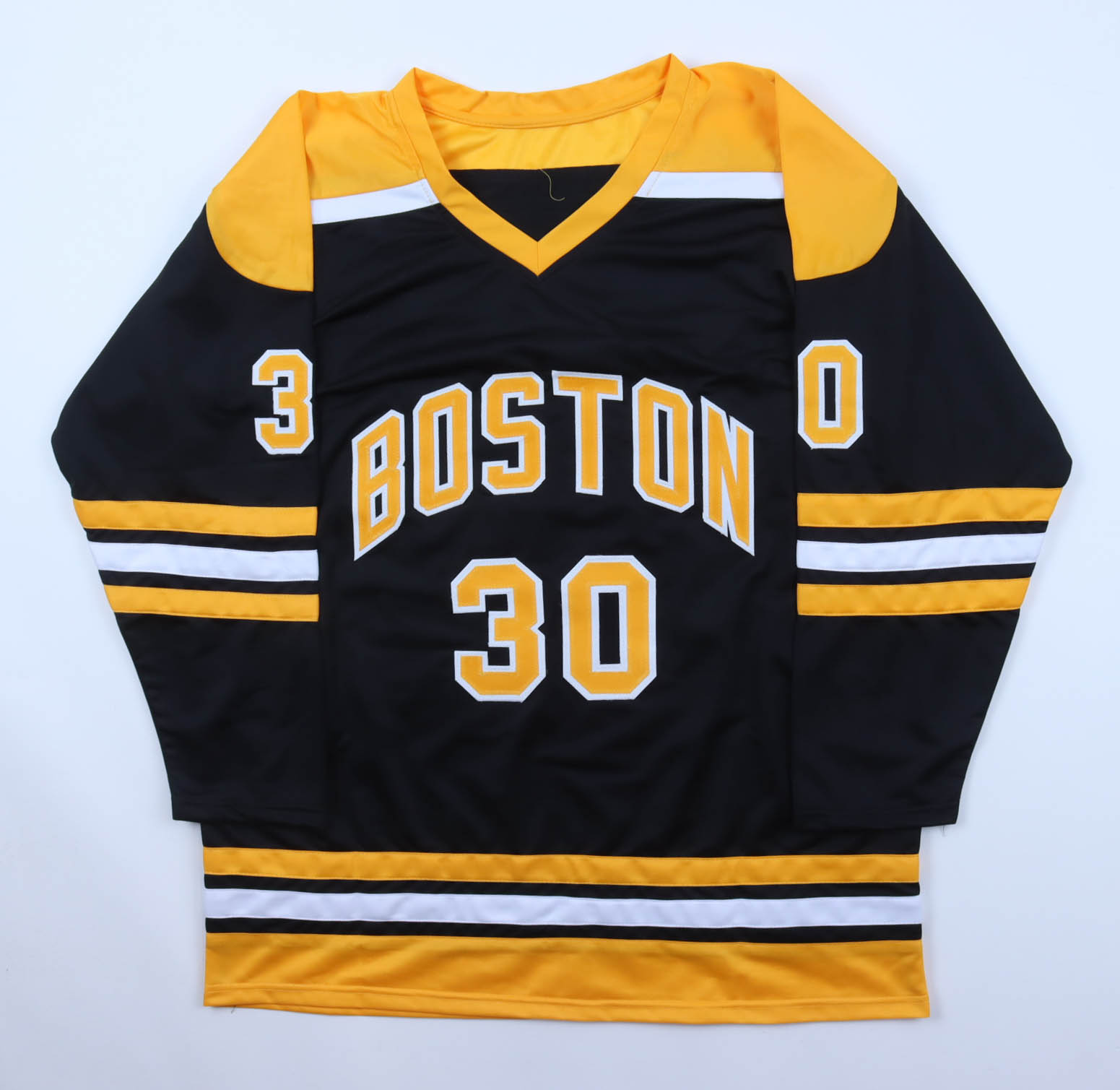 Custom jersey with everything sewn on, size XL. Hand-signed and inscribed by Gerry Cheevers (HOF).