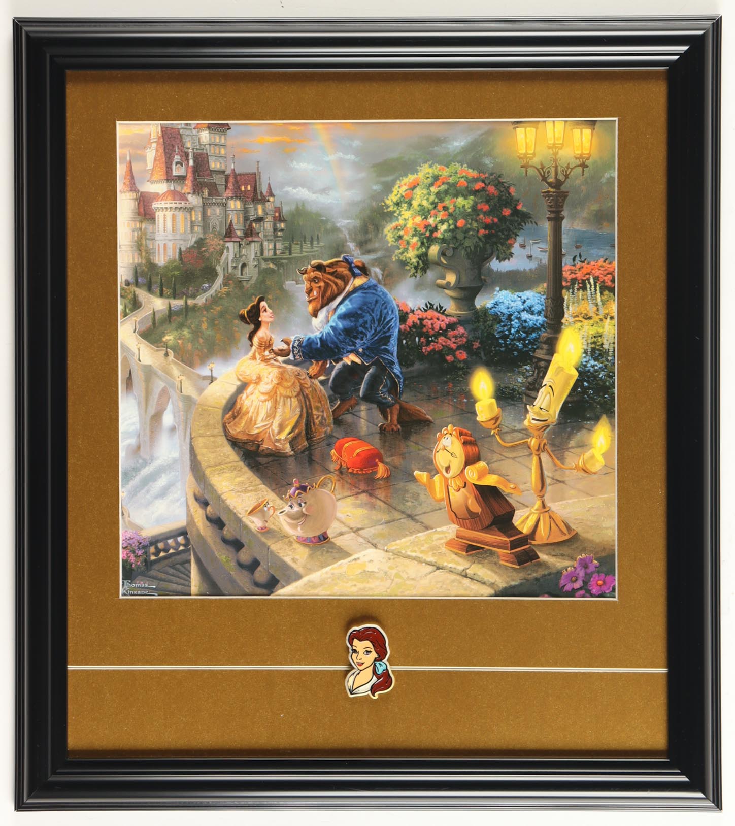 Thomas Kinkade Walt Disney's "Beauty and the Beast" Custom Framed Print Display with Disney Vintage Princess Belle Pin