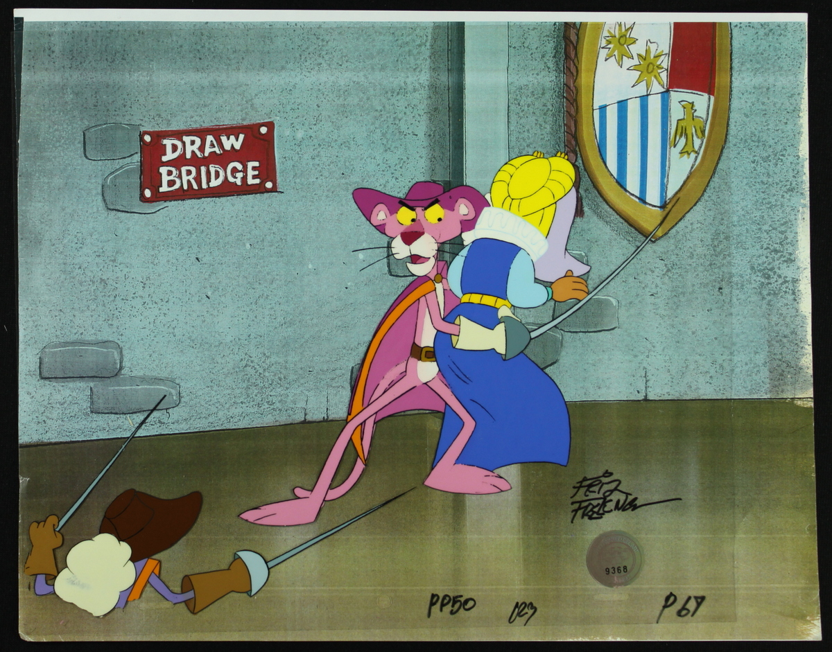 This lot includes an original hand-painted Production Cel along with the original animation sketch. This is a one-of-a-kind piece which was used in the production of an original Pink Panther cartoon. The cel is hand-signed in black felt tip pen by animator Friz Freleng (D 1995).