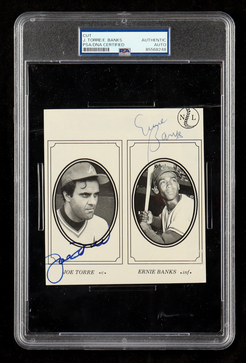 Cut measures approximately 4.75" x 5.25" in size has been hand-signed by Ernie Banks (D. 2015, Chicago Cubs, HOF) and Joe Torre (Atlanta Braves, HOF).