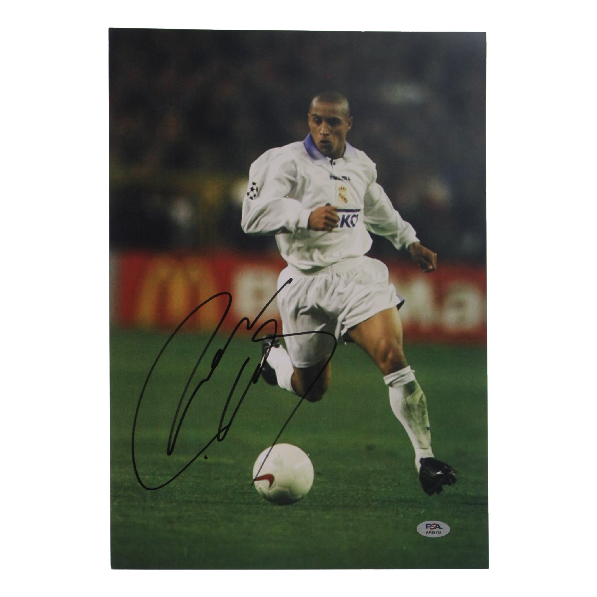 Photo measures approximately 11.25" x 16.25" in size. Hand-signed by Roberto Carlos (Real Madrid CF). Please note, there are minor creases throughout the photo.